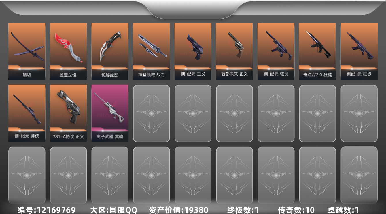 [12169769]10橙皮 1金皮 1紫皮 36皮肤 25英雄 76卡面 675已用源晶 黄金 优质装备:正义-781-A协议,冥驹-离子武器,狂徒-奇点//2.0,盖亚之愠,镭切,神圣领域 战刀,诡秘蛇影 套装:创·纪元套装 佩枪皮肤:正义-创·纪元,正义-西部未来 冲锋枪皮肤:骇灵-创·纪元 步枪皮肤:狂徒-创·纪元 狙击枪皮肤:莽侠-创·纪元