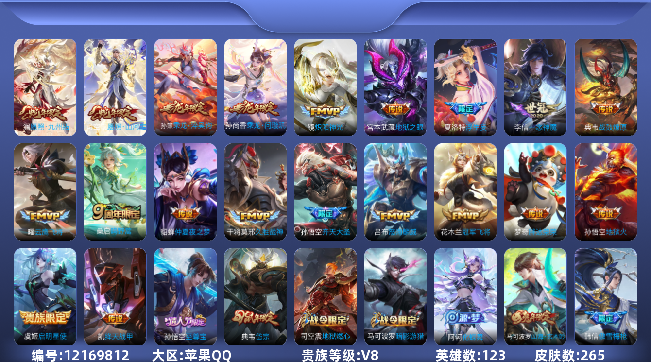[12169812]V8 20传说 123英雄 265皮肤 可修改实名 优质装备:冠军飞将,云鹰飞将(小将军),绛天战甲(鸡嘴战神),久胜战神,炽阳神光,一念神魔,地狱火,仲夏夜之梦(大飞蛾),地狱之眼,胖达荣荣,浮生妄 传说皮:乘龙·问璇玑(孙尚香年限),乘龙·淬吴钩(孙策年限),典韦战鼓燎原 珍宝阁皮:蔷薇恋人,玩趣恶龙 限定皮:愿照·九州拓(澜年限),愿照·山河定(司空震年限),逐霄战戟,鸣野蒿,至尊宝,傲雪梅枪,高山流水,齐天大圣,怒海麟威,五谷丰年,游园惊梦,岱宗(典韦年限),山海·玄木吟(马可年限) 史诗皮:绮世丹青,化蝶舞,星界战将,茶境仙,怒海争锋,破空之剑,蔬乡物语(鲁班七号),百相守梦-百里守约,紫霞仙子,电玩小子(小书包),黄金分割率,特工魅影,千年之狐,江河有灵,真我赫兹(百里守约),高渐离燃音魔法,蒙恬荣光圣徽,匿光破解者,偶像歌手,白蛇,电玩·爆裂旋风,暗夜猫娘,龙骑士(小龙虾),末日机甲-吕布,猫狗日记-孙策,乱世虎臣,节奏热浪,修罗,女仆咖啡,摇滚巨星,水果甜心,绅士熊喵,天才门将,星夜王子,心灵骇客,功夫厨神,德古拉伯爵,暗隐猎兽者,幽灵船长,鬼剑武藏,暗渊魔法,心灵战警,乐园奇幻夜,天秀·启明,舞动绿茵,地狱岩魂,拒霜思,缤纷独角兽,乘风破浪,逐浪之夏,水晶猎龙者,曙光守护者,箭羽风息,金属风暴,原初追逐者,圣诞狂欢,圣诞恋歌,鹰眼统帅,暗夜贵公子,黎明之约,赏金猎手,无心,未来纪元-赵云