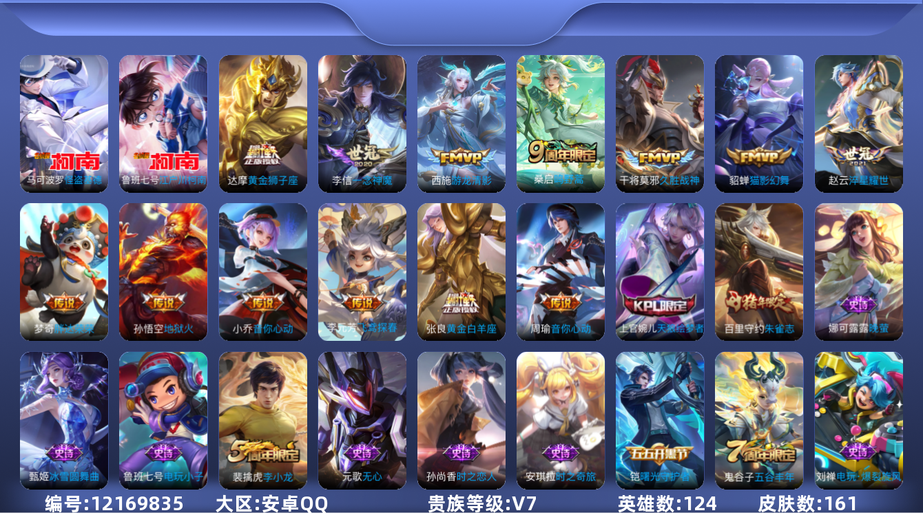 [12169835]V7 2珍品传说 13传说 124英雄 161皮肤 可修改实名 优质装备:江户川柯南,怪盗基德,黄金狮子座,黄金白羊座,猫影幻舞,久胜战神,一念神魔,地狱火,音你心动-小乔,飞鸢探春,音你心动-周瑜,胖达荣荣,游龙清影(小青龙),淬星耀世 珍宝阁皮:优雅恋人 限定皮:鸣野蒿,五谷丰年,天狼绘梦者,李小龙,朱雀志(守约年限) 史诗皮:蒙犽顽岩魄,苍穹之光,电玩小子(小书包),黄金分割率,千年之狐,匿光侦查者,高渐离燃音魔法,冰冠公主,青蛇,晚萤,电玩·爆裂旋风,末日机甲-吕布,时之恋人-孙尚香,乱世虎臣,女仆咖啡,水果甜心,绅士熊喵,天才门将,心灵骇客,时之奇旅-安琪拉,德古拉伯爵,暗隐猎兽者,幽灵船长,鬼剑武藏,心灵战警,舞动绿茵,缤纷独角兽,乘风破浪,水晶猎龙者,曙光守护者,箭羽风息,金属风暴,圣诞狂欢,圣诞恋歌,鹰眼统帅,暗夜贵公子,黎明之约,无心