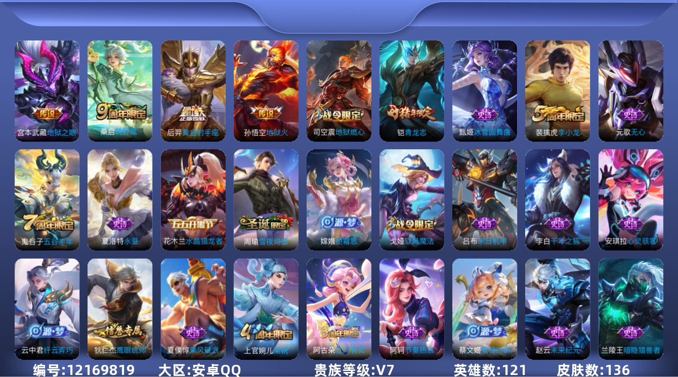 - [12090176]V8 1典藏 16传说 124英雄 240皮肤 可修改实名 优质装备:杀手不太冷,黄金狮子座,黄金射手座,云鹰飞将(小将军),猫影幻舞,炽阳神光,一念神魔,云霓雀翎,地狱火,仲夏夜之梦(大飞蛾) 珍宝阁皮:妄想食味 限定皮:愿照·九州拓(澜年限),鸣野蒿,至尊宝,白虎志(电光耗子),凤求凰(白切鸡),太华(伽罗年限),时之彼端,神威(电光马子),飞衡(韩信年限),玄嵩(庄周年限),瑞麟志(木兰年限),游园惊梦,梁祝,天狼狩猎者,烈魂,天狼绘梦者,李小龙,辉光之辰,奇迹圣诞,大圣娶亲,天魔缭乱,冰霜恋舞曲 史诗皮:龙之律动,石田雨龙,紫霞仙子,白龙吟,黄金分割率,特工魅影,千年之狐,江河有灵,魅语,无限星赏官,冰冠公主,偶像歌手,晚萤,猫狗日记-孙策,猫狗日记-大乔,时之恋人-孙尚香,乱世虎臣,节奏热浪,修罗,女仆咖啡,摇滚巨星,水果甜心,天才门将,心灵骇客,功夫厨神,德古拉伯爵,暗隐猎兽者,鬼剑武藏,地狱岩魂,纤云弄巧,缤纷独角兽,乘风破浪,逐浪之夏,水晶猎龙者,曙光守护者,箭羽风息,金属风暴,圣诞狂欢,圣诞恋歌,鹰眼统帅,暗夜贵公子,魅力维加斯,未来纪元-赵云
