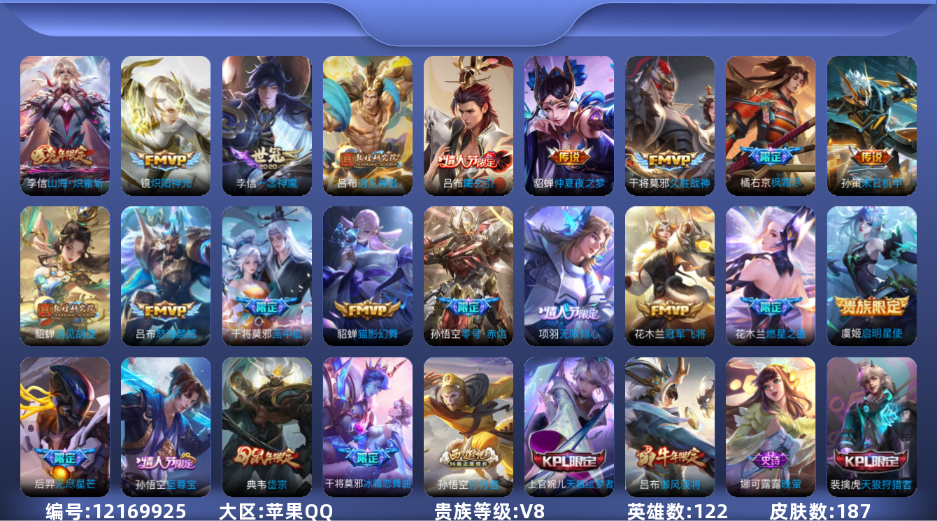 [12169925]V8 19传说 122英雄 187皮肤 可修改实名 优质装备:冠军飞将,猫影幻舞,久胜战神,炽阳神光,一念神魔,仲夏夜之梦(大飞蛾),零号·赤焰,遇见胡旋,末日机甲-孙策,山海·炽霜斩(李信年限),燃星之曲,画中仙,遇见神鼓 传说皮:吕布曦玄引 限定皮:逐霄战戟,至尊宝,无限倾心-项羽,匿光决锋者,怒海麟威,降魔,五谷丰年,梁祝,御风骁将(吕布年限),天狼狩猎者,岱宗(典韦年限),逐梦之音,天狼绘梦者,孙行者,冰霜恋舞曲,热情桑巴,无尽星芒,枫霜尽,神器·万象笔,梦圆繁星 史诗皮:黄金分割率,特工魅影,千年之狐,蒙恬荣光圣徽,冰冠公主,偶像歌手,晚萤,末日机甲-吕布,猫狗日记-孙策,时之恋人-孙尚香,乱世虎臣,修罗,水果甜心,绅士熊喵,心灵骇客,暗隐猎兽者,乐园奇幻夜,舞动绿茵,地狱岩魂,拒霜思,乘风破浪,水晶猎龙者,曙光守护者,箭羽风息,唤灵魅影,金属风暴,圣诞狂欢,圣诞恋歌,鹰眼统帅,魅力维加斯,黎明之约,天秀·音浪,无心,未来纪元-赵云