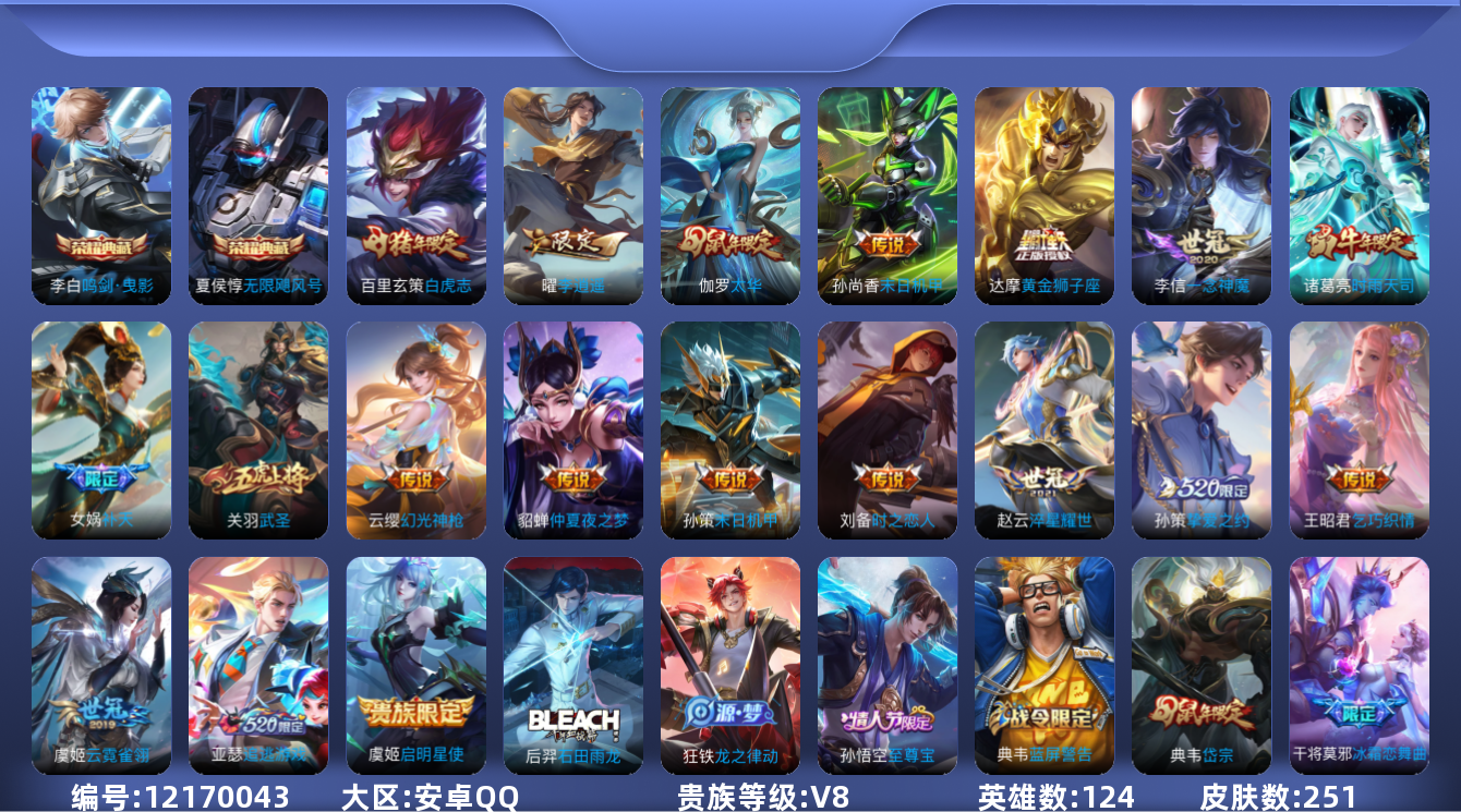 [12170043]【商品标题】:安卓Q-V8-永恒钻石I段位-124英雄-251皮肤-2典藏-0珍品无双-0无双-0珍品传说-19传说-70史诗
