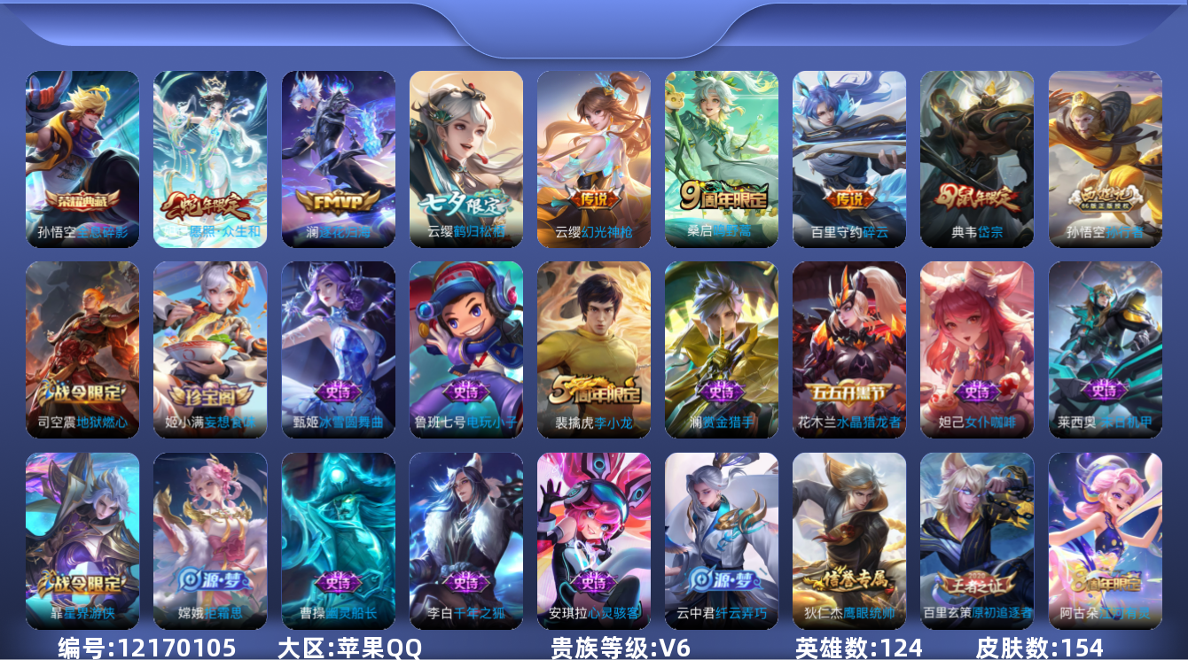 [12170105]V6 1典藏 6传说 124英雄 154皮肤 可修改实名 优质装备:全息碎影(猴子典藏),碎云,鹤归松栖(云缨),澜逐花归海 传说皮:幻光神枪 珍宝阁皮:妄想食味 限定皮:愿照·众生和(妲己年限),鸣野蒿,岱宗(典韦年限),李小龙,孙行者 史诗皮:星界战将,蒙犽顽岩魄,苍穹之光,电玩小子(小书包),千年之狐,江河有灵,末日机甲-莱西奥,百解令(蒙犽),猫狗日记-孙策,猫狗日记-大乔,乱世虎臣,女仆咖啡,水果甜心,心灵骇客,功夫厨神,德古拉伯爵,暗隐猎兽者,幽灵船长,鬼剑武藏,心灵战警,纤云弄巧,拒霜思,逐浪之夏,水晶猎龙者,唤灵魅影,金属风暴,原初追逐者,圣诞狂欢,圣诞恋歌,鹰眼统帅,暗夜贵公子,魅力维加斯,赏金猎手,未来纪元-赵云