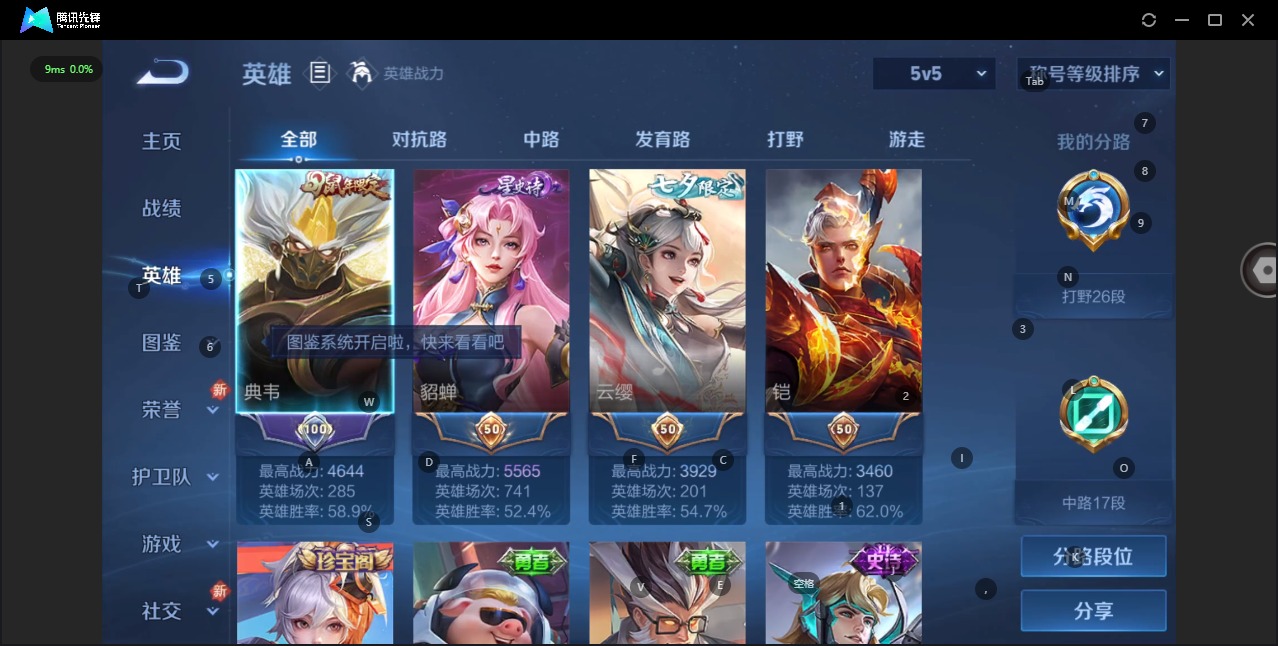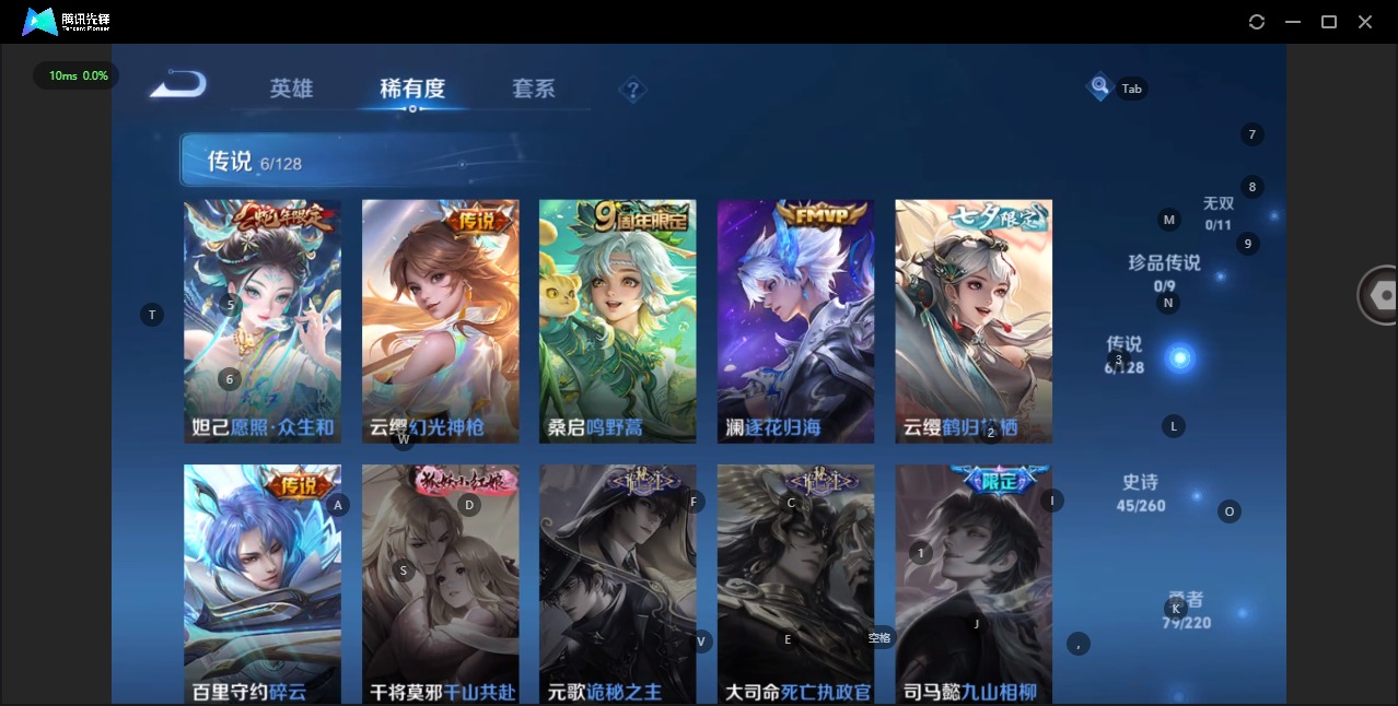 - [11606322]V5 4传说 75英雄 61皮肤 可修改实名 优质装备:猫影幻舞,澜逐花归海 传说皮:云诺千山 限定皮:逐霄战戟,鸣野蒿 史诗皮:龙之律动,百相守梦-黄忠,无限星赏官,女仆咖啡,水果甜心,未来纪元-赵云