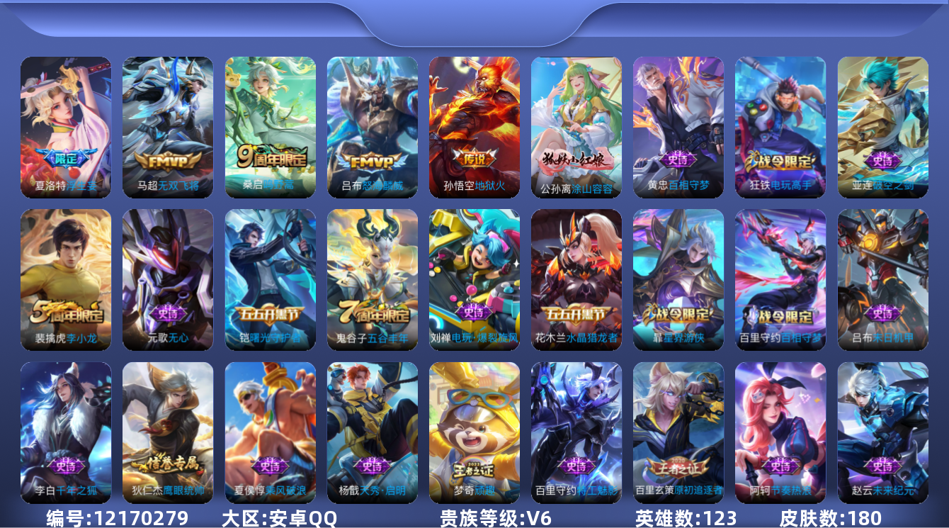 [12170279]V6 5传说 123英雄 180皮肤 可修改实名 优质装备:地狱火,无双飞将,浮生妄,涂山容容 珍宝阁皮:玩趣恶龙 限定皮:逐霄战戟,鸣野蒿,怒海麟威,五谷丰年,李小龙 史诗皮:星界战将,破空之剑,百相守梦-百里守约,百相守梦-黄忠,特工魅影,千年之狐,蒙恬荣光圣徽,冰冠公主,偶像歌手,电玩·爆裂旋风,末日机甲-吕布,猫狗日记-孙策,节奏热浪,水果甜心,功夫厨神,德古拉伯爵,鬼剑武藏,心灵战警,天秀·启明,乘风破浪,水晶猎龙者,曙光守护者,金属风暴,原初追逐者,圣诞恋歌,鹰眼统帅,魅力维加斯,黎明之约,无心,未来纪元-赵云