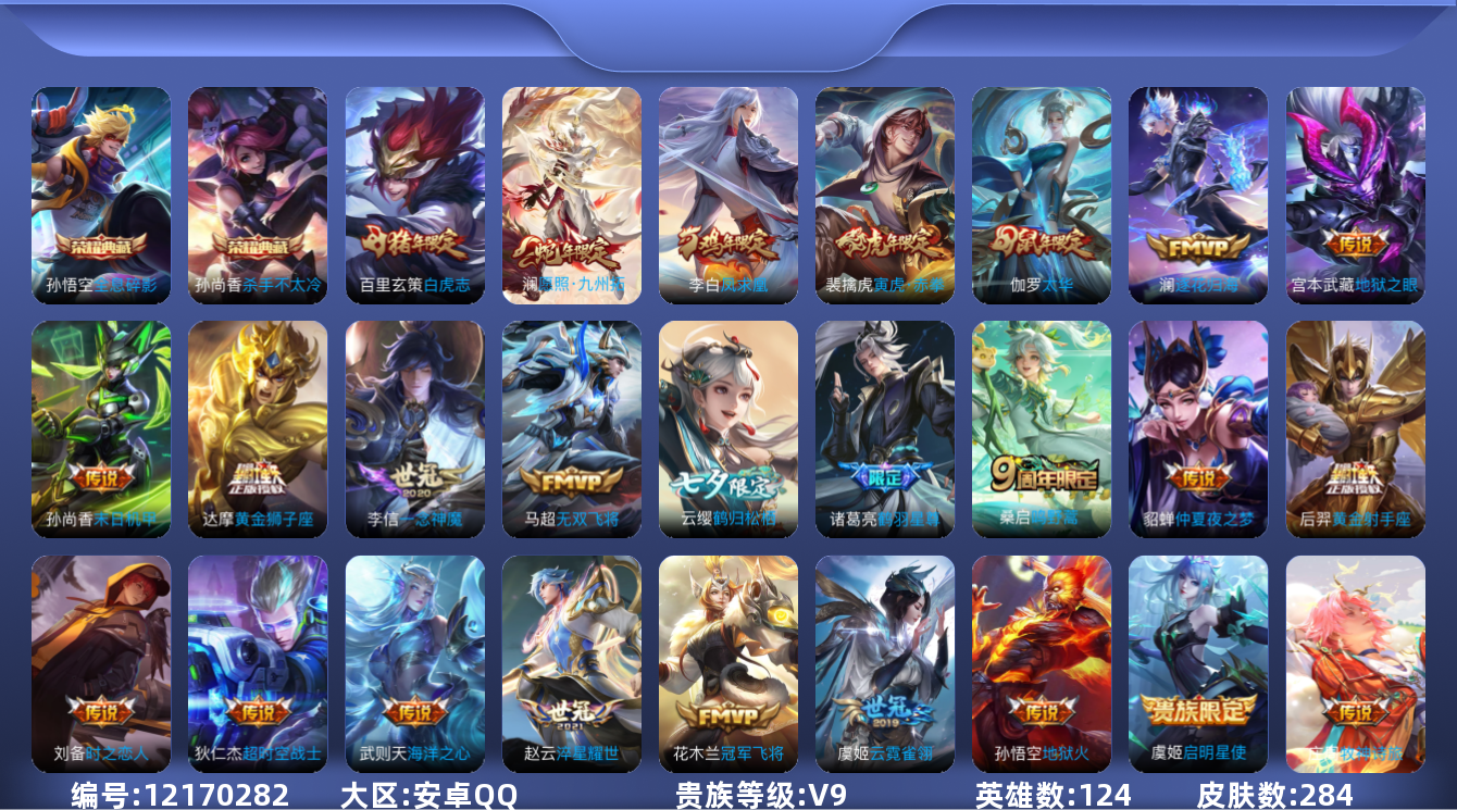 [12170282]V9 2典藏 25传说 124英雄 284皮肤 典藏英雄武则天 可修改实名 优质装备:杀手不太冷,全息碎影(猴子典藏),黄金狮子座,黄金射手座,冠军飞将,一念神魔,云霓雀翎,末日机甲-孙尚香(绿蚂蚱),地狱火,仲夏夜之梦(大飞蛾),海洋之心,地狱之眼,时之恋人-刘备(电焊工),淬星耀世,超时空战士-狄仁杰,无双飞将,鹤羽星尊,鹤归松栖(云缨),澜逐花归海,牧神诗旅 珍宝阁皮:妄想食味,优雅恋人 限定皮:愿照·九州拓(澜年限),鸣野蒿,白虎志(电光耗子),凤求凰(白切鸡),太华(伽罗年限),神威(电光马子),飞衡(韩信年限),高山流水,游园惊梦,梁祝,龙胆,岱宗(典韦年限),天狼征服者,天狼绘梦者,李小龙,辉光之辰,如梦令-后羿,神奇女侠,寅虎·赤拳(老虎年限),山海·玄木吟(马可年限) 史诗皮:化蝶舞,星界战将,龙之律动,藏狐·褐绒,石田雨龙,茶境仙,破空之剑,埋骨钱,百相守梦-百里守约,星界特工,紫霞仙子,苍穹之光,电玩小子(小书包),白龙吟,黄金分割率,特工魅影,千年之狐,江河有灵,百解令(蒙犽),高渐离燃音魔法,蒙恬荣光圣徽,无限星赏官,冰冠公主,青蛇,偶像歌手,暗夜猫娘,末日机甲-吕布,猫狗日记-孙策,时之恋人-孙尚香,乱世虎臣,节奏热浪,修罗,摇滚巨星,水果甜心,天才门将,星夜王子,心灵骇客,功夫厨神,德古拉伯爵,暗隐猎兽者,幽灵船长,鬼剑武藏,暗渊魔法,心灵战警,乐园奇幻夜,纤云弄巧,拒霜思,缤纷独角兽,乘风破浪,逐浪之夏,水晶猎龙者,曙光守护者,箭羽风息,金属风暴,原初追逐者,圣诞狂欢,圣诞恋歌,鹰眼统帅,暗夜贵公子,魅力维加斯,黎明之约,雪上飞焰,赏金猎手