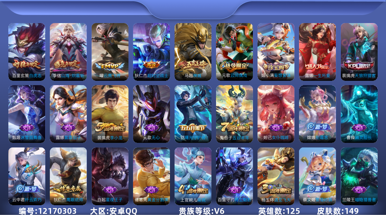 [12170303]V6 4传说 125英雄 149皮肤 可修改实名 优质装备:云鹰飞将(小将军),超时空战士-狄仁杰,山海·炽霜斩(李信年限) 珍宝阁皮:妄想食味,优雅恋人 限定皮:白虎志(电光耗子),神威(电光马子),遇见飞天,五谷丰年,梁祝,天狼狩猎者,李小龙,奇迹圣诞,一生所爱,云端筑梦师 史诗皮:紫霞仙子,黄金分割率,特工魅影,偶像歌手,女仆咖啡,水果甜心,星夜王子,德古拉伯爵,暗隐猎兽者,幽灵船长,鬼剑武藏,纤云弄巧,繁星吟游(呼啦呼啦),拒霜思,缤纷独角兽,曙光守护者,金属风暴,圣诞狂欢,圣诞恋歌,鹰眼统帅,黎明之约,无心