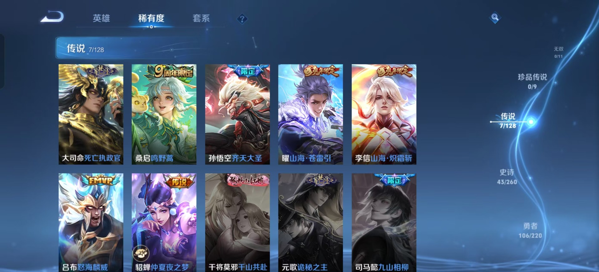 - [11341922]V7 1典藏 1珍品传说 8传说 124英雄 205皮肤 可修改实名 优质装备:弑枪猎影(韩信典藏),器灵·落星盏,猫影幻舞,一念神魔,末日机甲-孙策 传说皮:幻光神枪 珍宝阁皮:优雅恋人,蔷薇恋人,女武神 限定皮:愿照·岁时盈(虞姬年限),逐霄战戟,至尊宝,武陵仙君(小桃花),飞衡(韩信年限),高山流水,诗剑行,怒海麟威,五谷丰年,游园惊梦,岱宗(典韦年限),孙行者,引擎之心 史诗皮:器灵·浮梦炉,化蝶舞,星界战将,龙之律动,茶境仙,百相守梦-百里守约,紫霞仙子,苍穹之光,黄金分割率,特工魅影,江河有灵,蒙恬荣光圣徽,偶像歌手,暗夜猫娘,末日机甲-吕布,猫狗日记-孙策,时之恋人-孙尚香,乱世虎臣,节奏热浪,女仆咖啡,摇滚巨星,水果甜心,绅士熊喵,天才门将,星夜王子,心灵骇客,功夫厨神,德古拉伯爵,暗隐猎兽者,幽灵船长,鬼剑武藏,心灵战警,舞动绿茵,地狱岩魂,纤云弄巧,拒霜思,缤纷独角兽,乘风破浪,逐浪之夏,水晶猎龙者,金属风暴,原初追逐者,圣诞恋歌,鹰眼统帅,魅力维加斯,黎明之约,无心,未来纪元-赵云