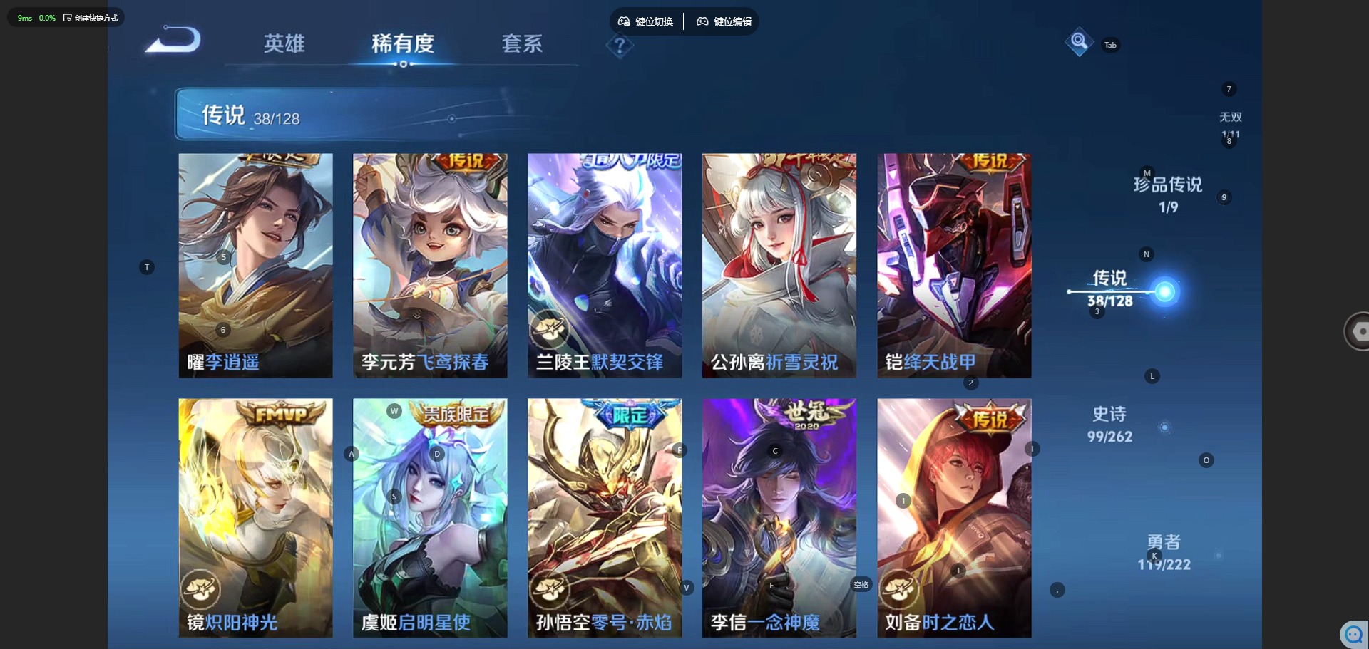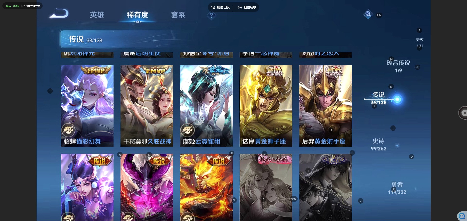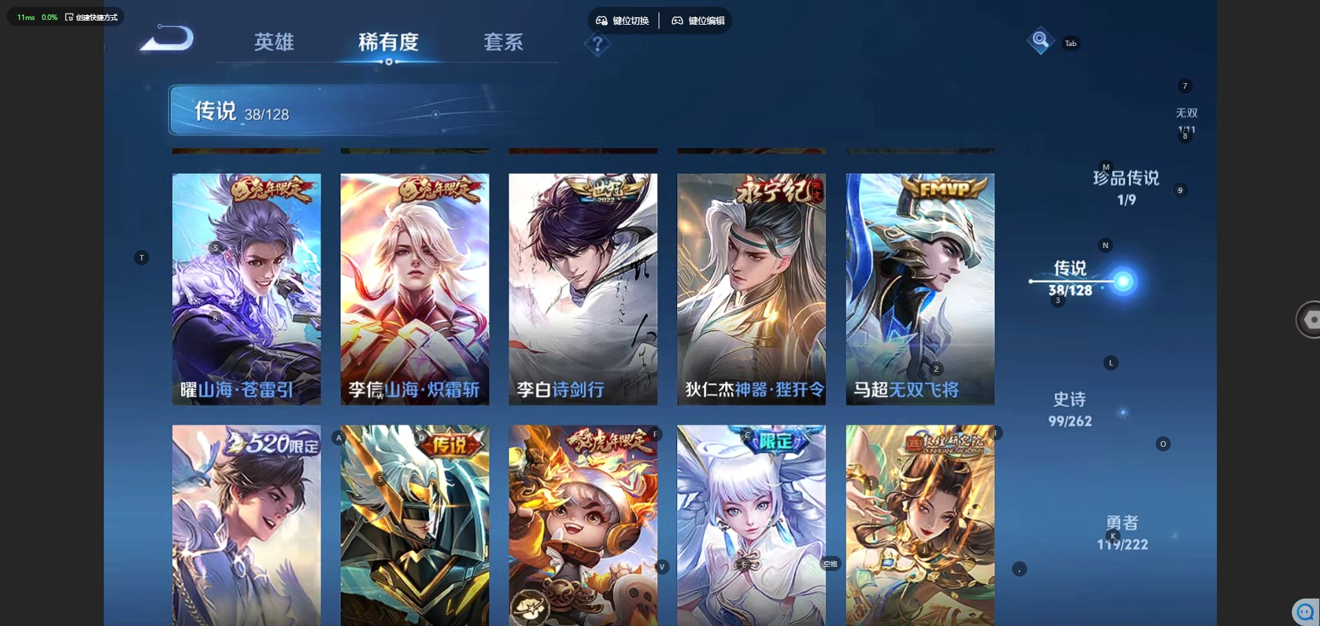- [11227410]V7 1典藏 6传说 123英雄 222皮肤 可修改实名 荣耀水晶:鸣剑·曳影 传说皮:地狱火,仲夏夜之梦(大飞蛾),一念神魔 珍宝阁皮:优雅恋人,蔷薇恋人 限定皮:至尊宝,白虎志(电光耗子),凤求凰(白切鸡),武陵仙君(小桃花),遇见飞天,五谷丰年,梁祝,天狼狩猎者,李小龙,朱雀志(守约年限),霸王别姬-项羽,默契交锋-花木兰,猪悟能,一生所爱,大圣娶亲,引擎之心,青春决赛季 史诗皮:紫霞仙子,电玩小子(小书包),白龙吟,黄金分割率,特工魅影,千年之狐,江河有灵,冰冠公主,晚萤,龙骑士(小龙虾),末日机甲-吕布,猫狗日记-孙策,乱世虎臣,女仆咖啡,水果甜心,绅士熊喵,天才门将,星夜王子,心灵骇客,功夫厨神,德古拉伯爵,暗隐猎兽者,幽灵船长,鬼剑武藏,心灵战警,舞动绿茵,地狱岩魂,纤云弄巧,繁星吟游(呼啦呼啦),缤纷独角兽,乘风破浪,逐浪之夏,水晶猎龙者,金属风暴,圣诞狂欢,圣诞恋歌,鹰眼统帅,魅力维加斯,未来纪元-赵云