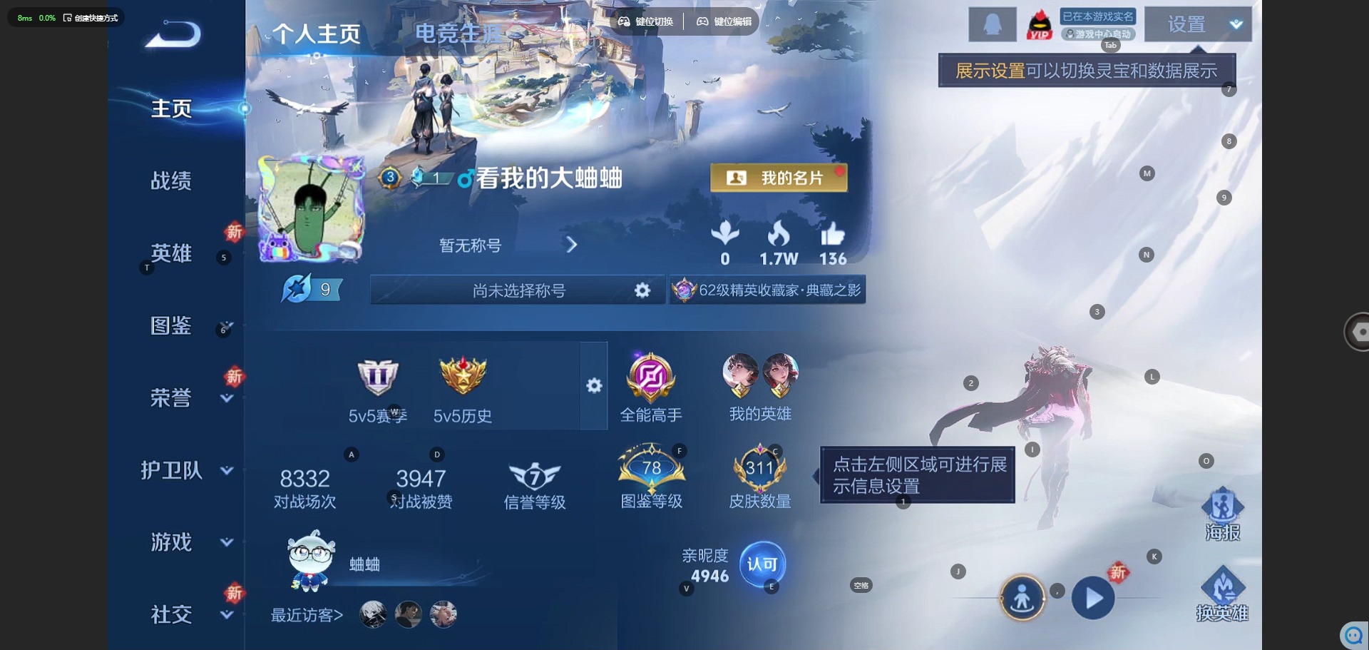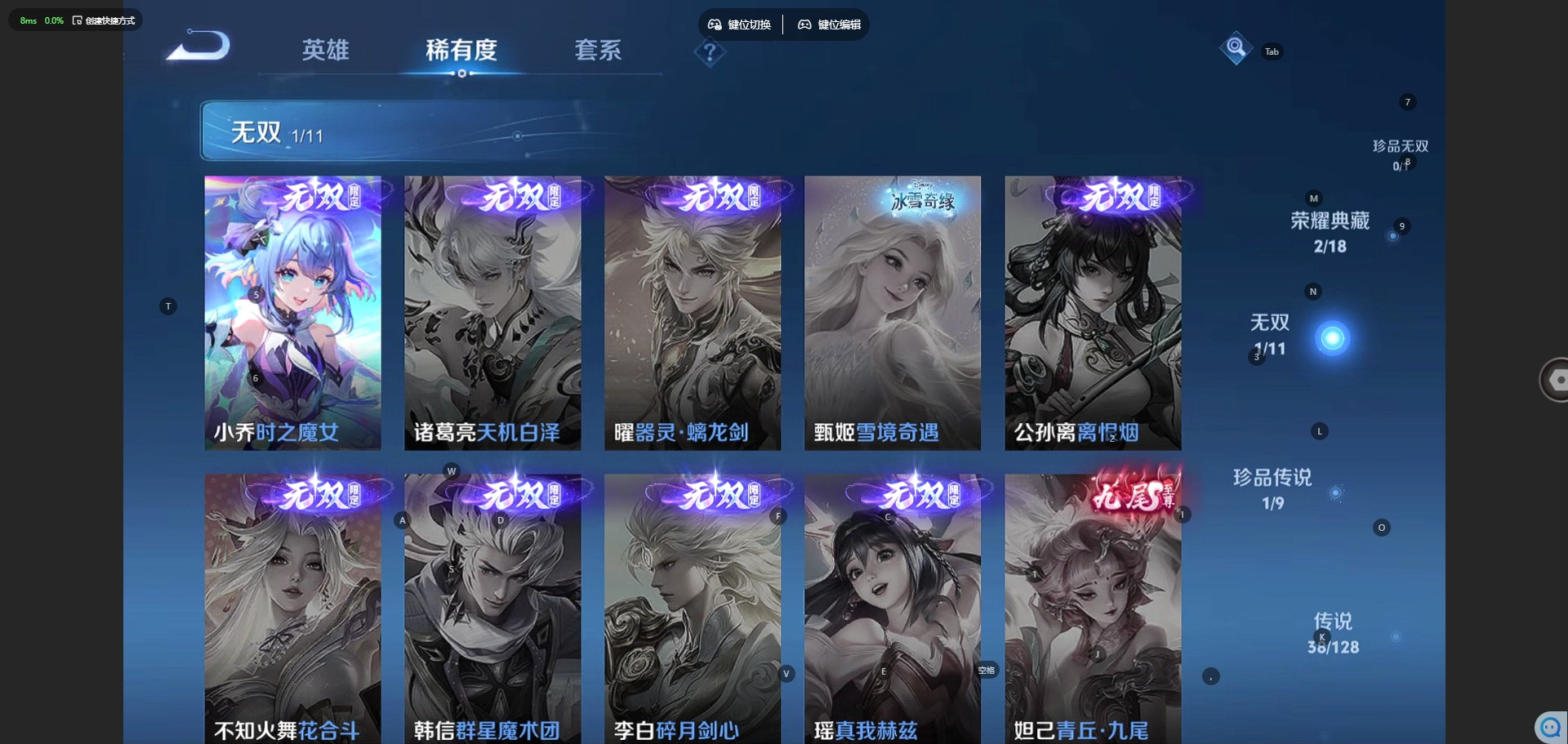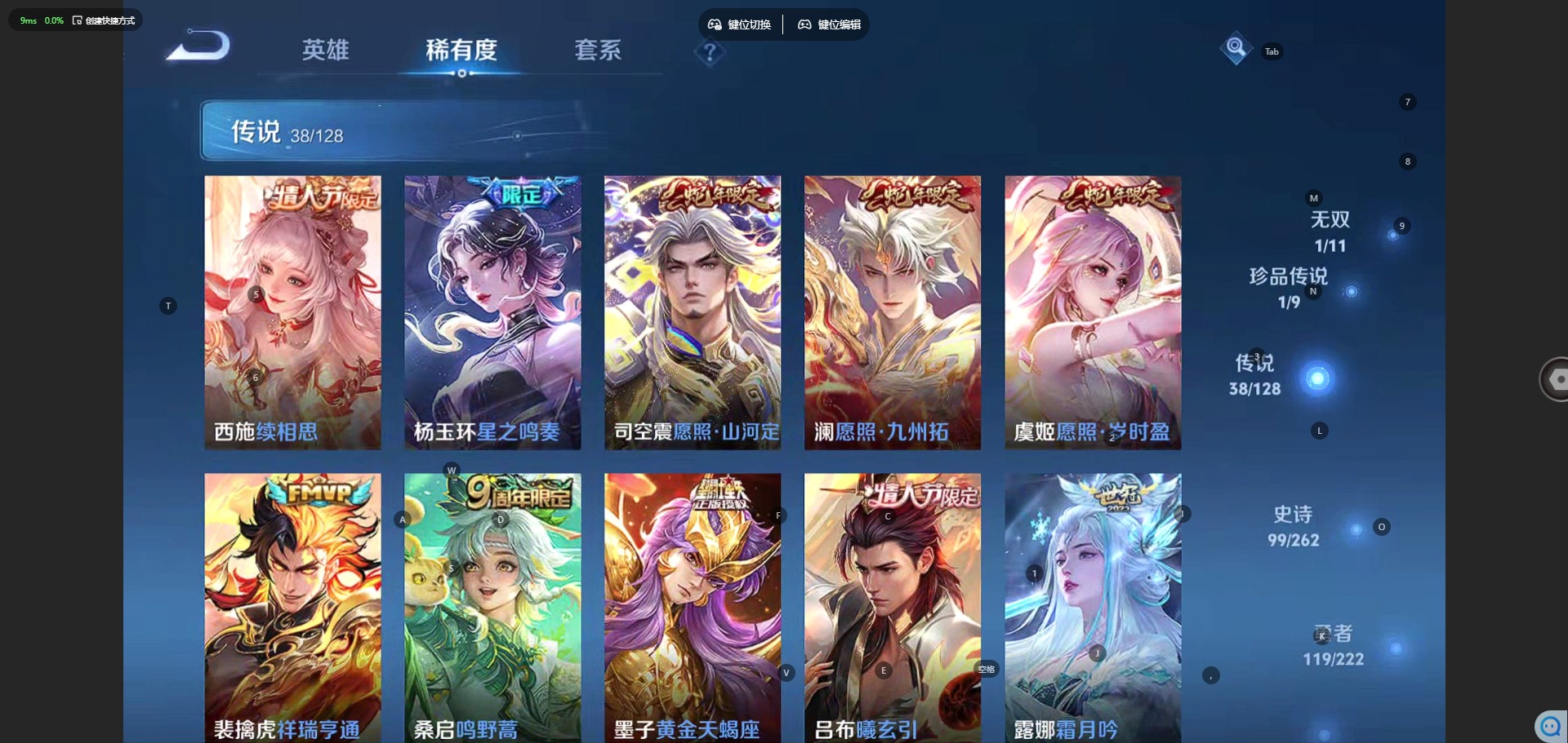 - [11227410]V7 1典藏 6传说 123英雄 222皮肤 可修改实名 荣耀水晶:鸣剑·曳影 传说皮:地狱火,仲夏夜之梦(大飞蛾),一念神魔 珍宝阁皮:优雅恋人,蔷薇恋人 限定皮:至尊宝,白虎志(电光耗子),凤求凰(白切鸡),武陵仙君(小桃花),遇见飞天,五谷丰年,梁祝,天狼狩猎者,李小龙,朱雀志(守约年限),霸王别姬-项羽,默契交锋-花木兰,猪悟能,一生所爱,大圣娶亲,引擎之心,青春决赛季 史诗皮:紫霞仙子,电玩小子(小书包),白龙吟,黄金分割率,特工魅影,千年之狐,江河有灵,冰冠公主,晚萤,龙骑士(小龙虾),末日机甲-吕布,猫狗日记-孙策,乱世虎臣,女仆咖啡,水果甜心,绅士熊喵,天才门将,星夜王子,心灵骇客,功夫厨神,德古拉伯爵,暗隐猎兽者,幽灵船长,鬼剑武藏,心灵战警,舞动绿茵,地狱岩魂,纤云弄巧,繁星吟游(呼啦呼啦),缤纷独角兽,乘风破浪,逐浪之夏,水晶猎龙者,金属风暴,圣诞狂欢,圣诞恋歌,鹰眼统帅,魅力维加斯,未来纪元-赵云