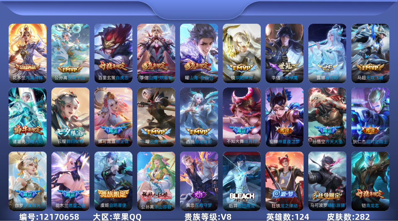 [12170658]V8 1典藏 20传说 124英雄 282皮肤 可修改实名 女号 优质装备:九霄神辉(木兰典藏),云鹰飞将(小将军),炽阳神光,一念神魔,仲夏夜之梦(大飞蛾),游龙清影(小青龙),超时空战士-狄仁杰,无双飞将,山海·炽霜斩(李信年限),山海·苍雷引(电光曜子),炽翼辉光(娃娃菜牛角包),燃星之曲,鹤归松栖(云缨),霜月吟,涂山容容 传说皮:云诺千山 珍宝阁皮:妄想食味,胡桃夹子 限定皮:白虎志(电光耗子),前尘镜,绯月行,时雨天司(水龙头),齐天大圣,五谷丰年,青龙志(铠年限),冰锋战神,梁祝,天狼狩猎者,逐梦之音,天狼绘梦者,李小龙,如梦令-嫦娥,霸王别姬-虞姬,默契交锋-花木兰,猪悟能,一生所爱,引擎之心,美猴王,神器·万象笔,山海·玄木吟(马可年限) 史诗皮:龙之律动,石田雨龙,上官婉儿群星魔术团,百相守梦-黄忠,千年之狐,永昼,江河有灵,百解令(蒙犽),蒙恬荣光圣徽,无限星赏官,暗夜猫娘,末日机甲-吕布,猫狗日记-孙策,女仆咖啡,摇滚巨星,水果甜心,绅士熊喵,星夜王子,德古拉伯爵,幽灵船长,鬼剑武藏,心灵战警,舞动绿茵,纤云弄巧,繁星吟游(呼啦呼啦),拒霜思,逐浪之夏,水晶猎龙者,曙光守护者,金属风暴,原初追逐者,圣诞狂欢,鹰眼统帅,魅力维加斯,黎明之约,无心,未来纪元-赵云,玫瑰异探