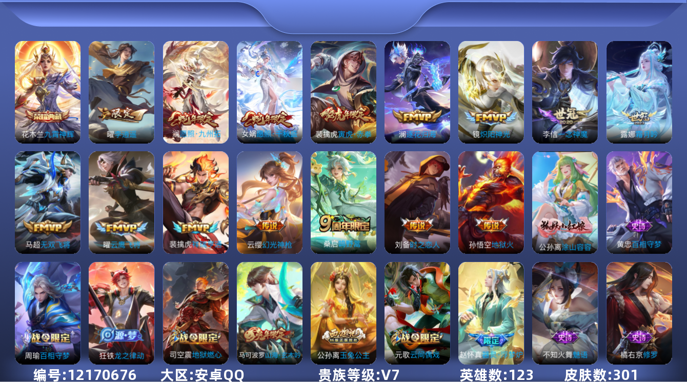 [12170676]V7 1典藏 15传说 123英雄 301皮肤 可修改实名 优质装备:九霄神辉(木兰典藏),云鹰飞将(小将军),炽阳神光,一念神魔,地狱火,李逍遥,时之恋人-刘备(电焊工),无双飞将,霜月吟,澜逐花归海,涂山容容 传说皮:祥瑞亨通,幻光神枪 珍宝阁皮:蔷薇恋人,女武神,玩趣恶龙 限定皮:愿照·九州拓(澜年限),愿照·千秋盛(女娲年限),逐霄战戟,鸣野蒿,五谷丰年,匿光追影者,寅虎·赤拳(老虎年限),玉兔公主,山海·玄木吟(马可年限) 史诗皮:器灵·浮梦炉,糖绘人间,星界战将,谪仙醉月,龙之律动,百相守梦-周瑜,茶境仙,破空之剑,蔬乡物语(鲁班七号),超元猎域,百相守梦-百里守约,百相守梦-黄忠,紫霞仙子,特工魅影,江河有灵,雪夜绮愿(周瑜),魅语,百解令(蒙犽),高渐离燃音魔法,偶像歌手,末日机甲-吕布,猫狗日记-孙策,乱世虎臣,节奏热浪,修罗,女仆咖啡,摇滚巨星,水果甜心,星夜王子,心灵骇客,功夫厨神,德古拉伯爵,暗隐猎兽者,幽灵船长,鬼剑武藏,暗渊魔法,心灵战警,乐园奇幻夜,舞动绿茵,纤云弄巧,拒霜思,缤纷独角兽,乘风破浪,逐浪之夏,月团寄思,水晶猎龙者,曙光守护者,箭羽风息,金属风暴,圣诞狂欢,圣诞恋歌,鹰眼统帅,暗夜贵公子,魅力维加斯,赏金猎手,天秀·音浪,无心,未来纪元-赵云