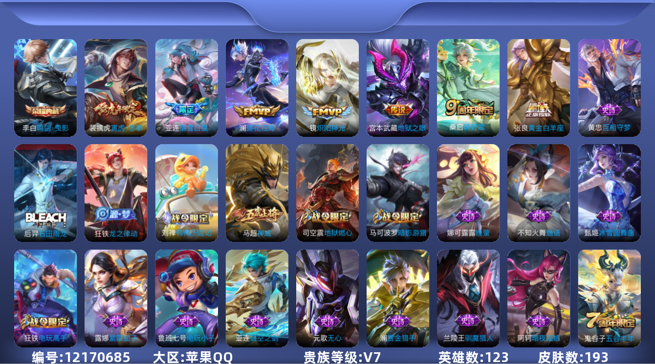 [12170685]V7 1典藏 7传说 123英雄 193皮肤 可修改实名 优质装备:鸣剑·曳影,黄金白羊座,炽阳神光,地狱之眼,澜逐花归海 传说皮:落雪白狼 珍宝阁皮:胡桃夹子,万物之道 限定皮:鸣野蒿,神威(电光马子),遇见飞天,高山流水,五谷丰年,寅虎·赤拳(老虎年限) 史诗皮:鸭鸭历险记-刘禅,星界战将,龙之律动,石田雨龙,破空之剑,百相守梦-黄忠,紫霞仙子,电玩小子(小书包),黄金分割率,特工魅影,千年之狐,江河有灵,魅语,百解令(蒙犽),蒙恬荣光圣徽,冰冠公主,偶像歌手,晚萤,电玩·爆裂旋风,暗夜猫娘,末日机甲-吕布,猫狗日记-大乔,节奏热浪,摇滚巨星,天才门将,星夜王子,心灵骇客,暗隐猎兽者,幽灵船长,鬼剑武藏,乐园奇幻夜,拒霜思,乘风破浪,逐浪之夏,水晶猎龙者,金属风暴,原初追逐者,圣诞狂欢,圣诞恋歌,鹰眼统帅,王者之锤,魅力维加斯,黎明之约,赏金猎手,无心,未来纪元-赵云