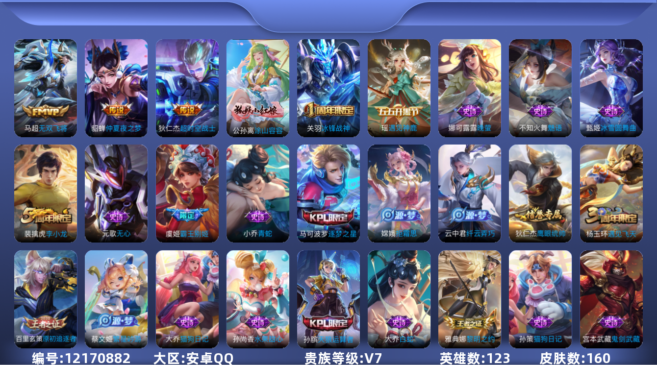 [12170882]V7 3传说 123英雄 160皮肤 可修改实名 优质装备:仲夏夜之梦(大飞蛾),超时空战士-狄仁杰,无双飞将,涂山容容 珍宝阁皮:优雅恋人 限定皮:遇见飞天,冰锋战神,天狼运算者,逐梦之星,李小龙,霸王别姬-虞姬 史诗皮:遇见神鹿,魅语,青蛇,偶像歌手,白蛇,晚萤,猫狗日记-孙策,猫狗日记-大乔,乱世虎臣,水果甜心,功夫厨神,德古拉伯爵,鬼剑武藏,舞动绿茵,纤云弄巧,繁星吟游(呼啦呼啦),拒霜思,缤纷独角兽,金属风暴,原初追逐者,圣诞恋歌,鹰眼统帅,魅力维加斯,黎明之约,无心