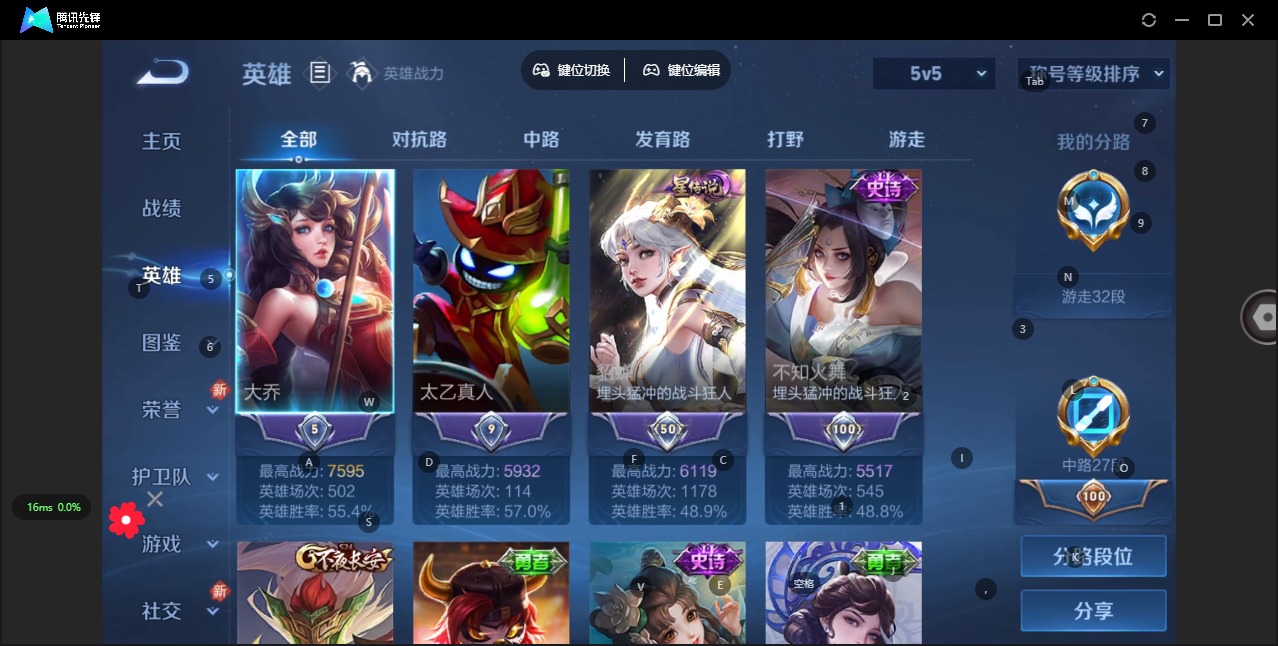 - PX_2017716-贵族等级: V5 英雄数: 110 皮肤数: 96 传说皮: 冠军飞将,云鹰飞将,妄想实况 限定皮: 李小龙,山海·玄木吟,鸣野蒿,逐霄战戟,愿照·九州拓