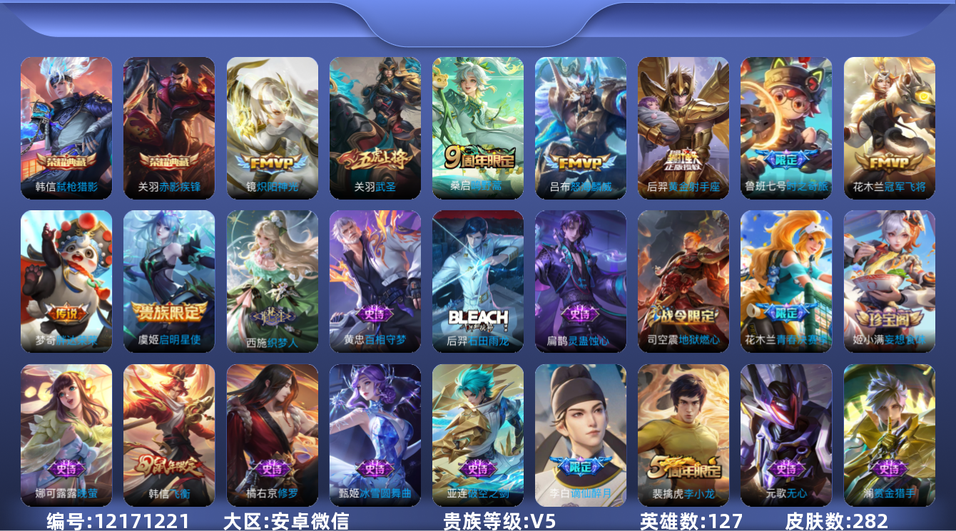 [12171221]【商品标题】:安卓WX-V5-最强王者段位-126英雄-279皮肤-2典藏-0珍品无双-0无双-0珍品传说-9传说-72史诗