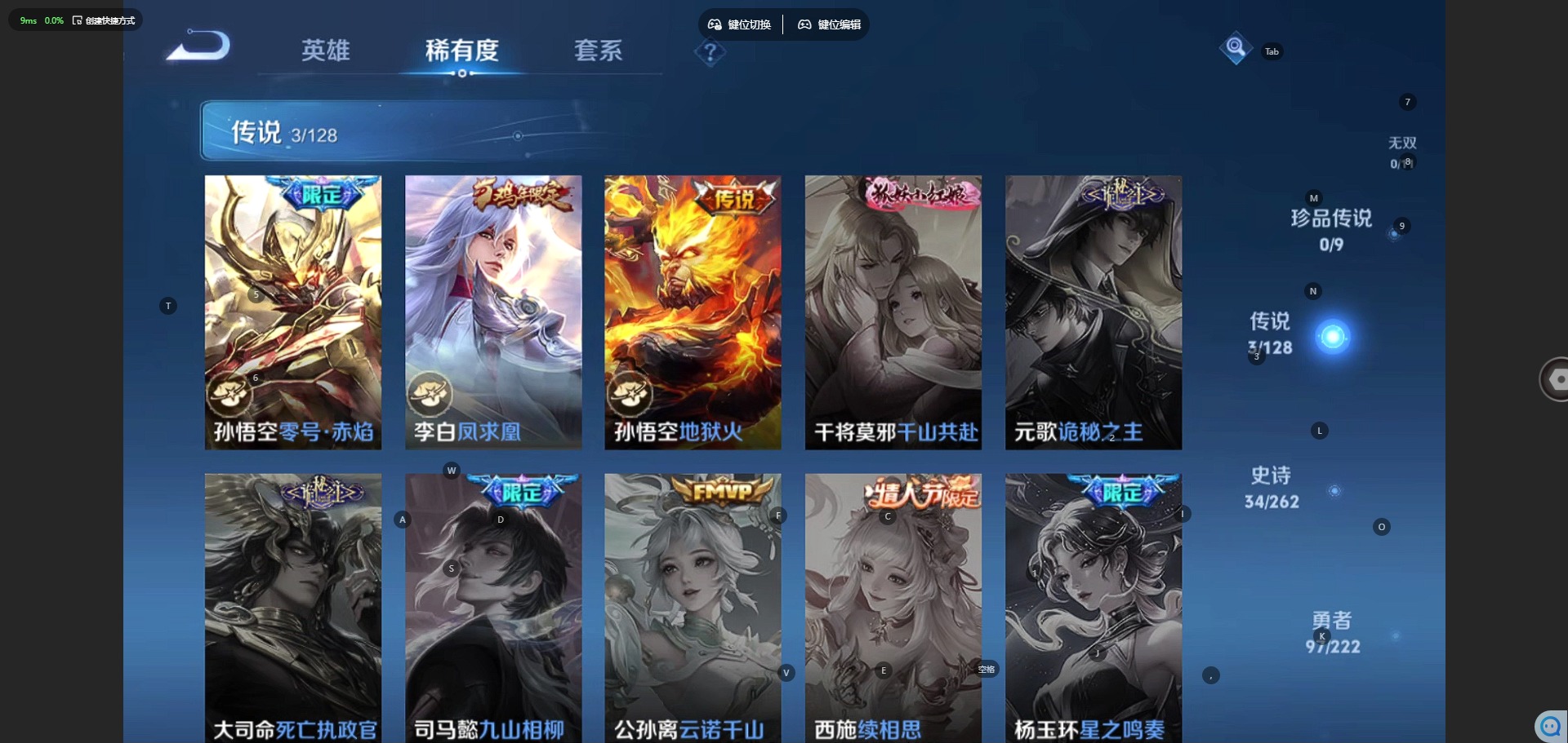 [12171356]V7 3传说 124英雄 188皮肤 可修改实名 优质装备:地狱火,零号·赤焰 珍宝阁皮:女武神 限定皮:逐霄战戟,至尊宝,凤求凰(白切鸡),梅西,白晶晶,遇见飞天,五谷丰年,梁祝,李小龙,美猴王 史诗皮:紫霞仙子,白龙吟,特工魅影,千年之狐,冰冠公主,偶像歌手,乱世虎臣,节奏热浪,摇滚巨星,水果甜心,心灵骇客,德古拉伯爵,鬼剑武藏,舞动绿茵,繁星吟游(呼啦呼啦),缤纷独角兽,水晶猎龙者,曙光守护者,原初追逐者,圣诞恋歌,鹰眼统帅,王者之锤,魅力维加斯