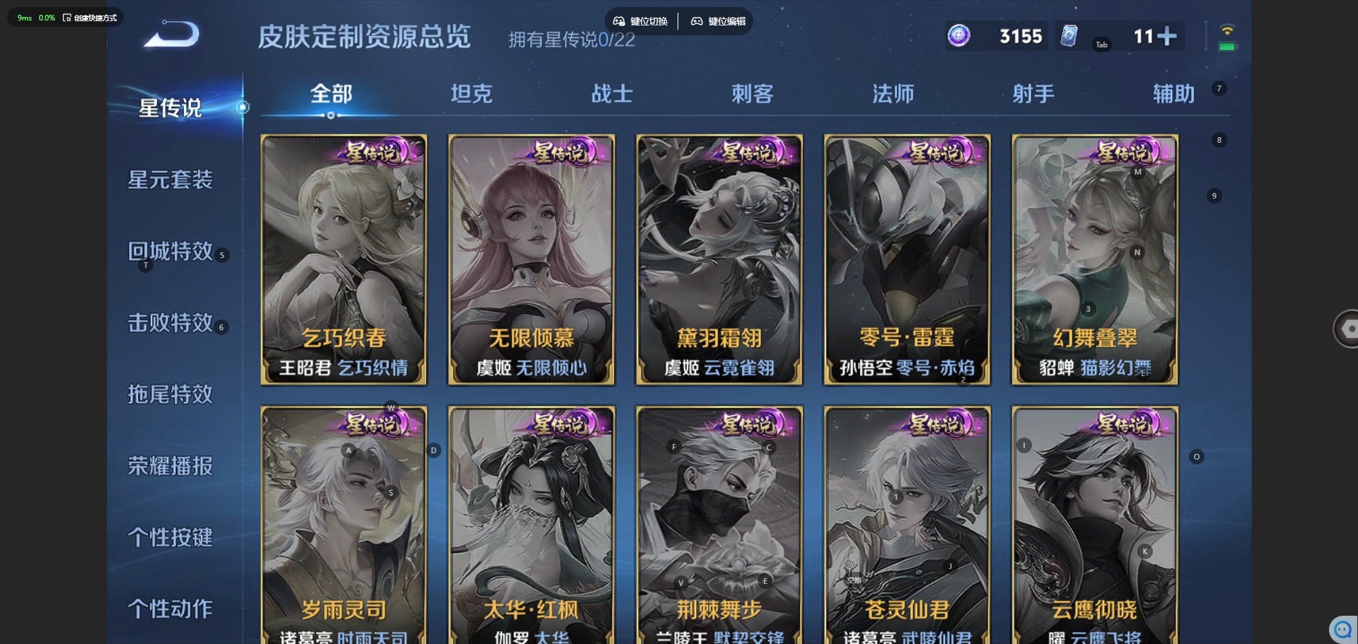 刘邦德古拉伯爵,阿轲节奏热浪,铠曙光守护者,小乔缤纷独角兽,露娜紫霞仙子,宫本武藏鬼剑武藏,貂蝉圣诞恋歌,花木兰水晶猎龙者,李白千年之狐,安琪拉心灵骇客,嬴政摇滚巨星,百里玄策原初追逐者,雅典娜冰冠公主,韩信白龙吟,百里守约特工魅影,蔡文姬舞动绿茵,王昭君偶像歌手