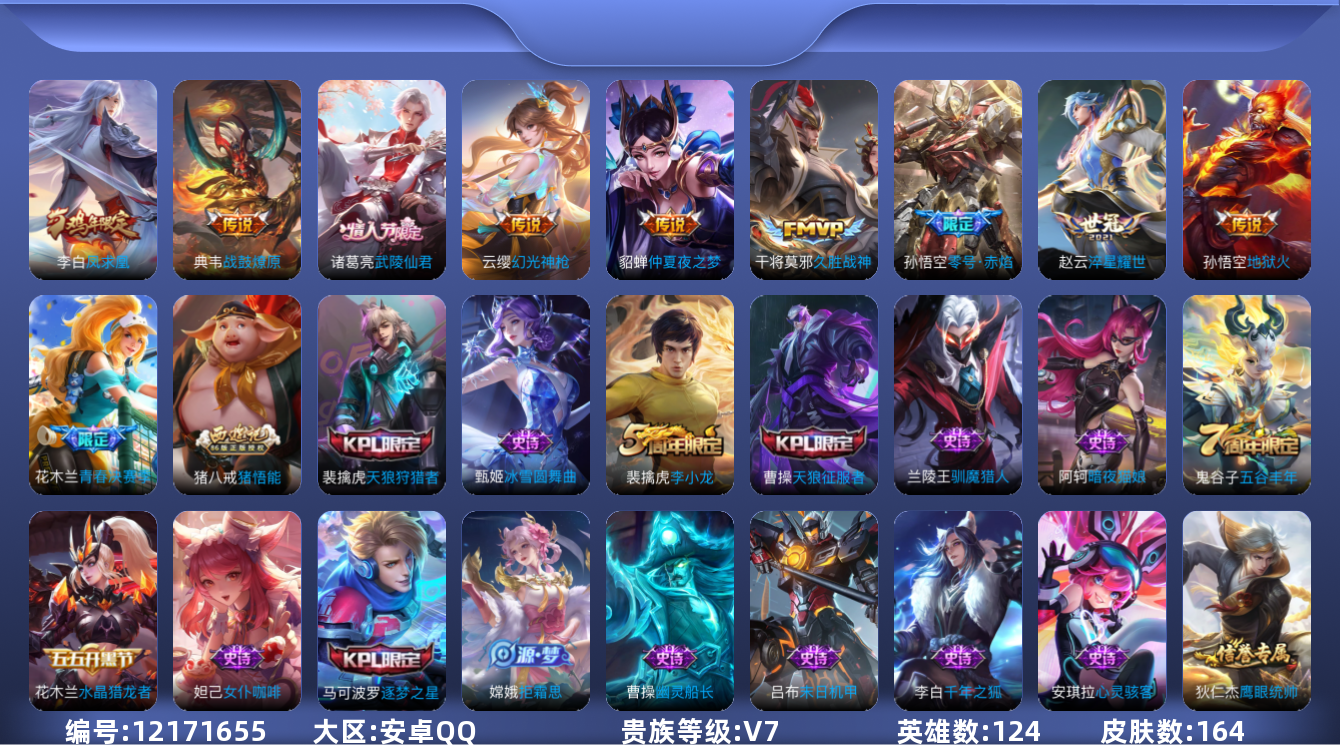 - [11864081]V8 1典藏 1珍品传说 24传说 124英雄 291皮肤 可修改实名 优质装备:九霄神辉(木兰典藏),器灵·落星盏,黄金狮子座,黄金射手座,冠军飞将,云鹰飞将(小将军),绛天战甲(鸡嘴战神),黄金白羊座,久胜战神,炽阳神光,一念神魔,末日机甲-孙尚香(绿蚂蚱),零号·赤焰,地狱之眼,乞巧织情,时之恋人-刘备(电焊工),淬星耀世,燃星之曲,画中仙,灼幽烈阳,涂山容容 传说皮:典韦战鼓燎原 珍宝阁皮:妄想食味,万物之道,蔷薇恋人 限定皮:愿照·九州拓(澜年限),鸣野蒿,至尊宝,神威(电光马子),瑞麟志(木兰年限),遇见飞天,高山流水,诗剑行,五谷丰年,游园惊梦,梁祝,御风骁将(吕布年限),天狼绘梦者,李小龙,默契交锋-花木兰,孙行者,引擎之心,青春决赛季,深海之息(深海大菠萝) 史诗皮:器灵·浮梦炉,化蝶舞,龙之律动,石田雨龙,百相守梦-黄忠,织梦人,遇见神鹿,紫霞仙子,苍穹之光,电玩小子(小书包),黄金分割率,特工魅影,千年之狐,永昼,江河有灵,百解令(蒙犽),蒙恬荣光圣徽,偶像歌手,电玩·爆裂旋风,百相守梦(刘备),龙骑士(小龙虾),末日机甲-吕布,猫狗日记-孙策,猫狗日记-大乔,时之恋人-孙尚香,乱世虎臣,节奏热浪,修罗,女仆咖啡,摇滚巨星,水果甜心,绅士熊喵,天才门将,星夜王子,心灵骇客,功夫厨神,德古拉伯爵,暗隐猎兽者,幽灵船长,鬼剑武藏,心灵战警,舞动绿茵,地狱岩魂,纤云弄巧,繁星吟游(呼啦呼啦),拒霜思,缤纷独角兽,乘风破浪,逐浪之夏,水晶猎龙者,曙光守护者,箭羽风息,金属风暴,原初追逐者,圣诞狂欢,圣诞恋歌,鹰眼统帅,王者之锤,魅力维加斯,无心,未来纪元-赵云