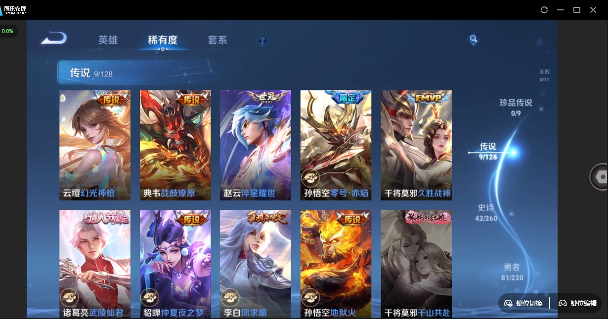 - [11290510]V8 1典藏 7传说 117英雄 164皮肤 可修改实名 荣耀水晶:全息碎影(猴子典藏) 传说皮:黄金狮子座,地狱火,地狱之眼,末日机甲-孙尚香(绿蚂蚱),云鹰飞将(小将军),超时空战士-狄仁杰 限定皮:至尊宝,梅西,神威(电光马子),飞衡(韩信年限),梁祝,烈魂,逐梦之音,天狼绘梦者,辉光之辰,大圣娶亲,蜜橘之夏,热情桑巴 史诗皮:化蝶舞,遇见神鹿,紫霞仙子,苍穹之光,电玩小子(小书包),白龙吟,黄金分割率,特工魅影,千年之狐,暗夜猫娘,冰冠公主,魅语,偶像歌手,猫狗日记-孙策,节奏热浪,修罗,天才门将,心灵战警,纤云弄巧,繁星吟游(呼啦呼啦),缤纷独角兽,乘风破浪,逐浪之夏,水晶猎龙者,曙光守护者,圣诞狂欢,圣诞恋歌,鹰眼统帅