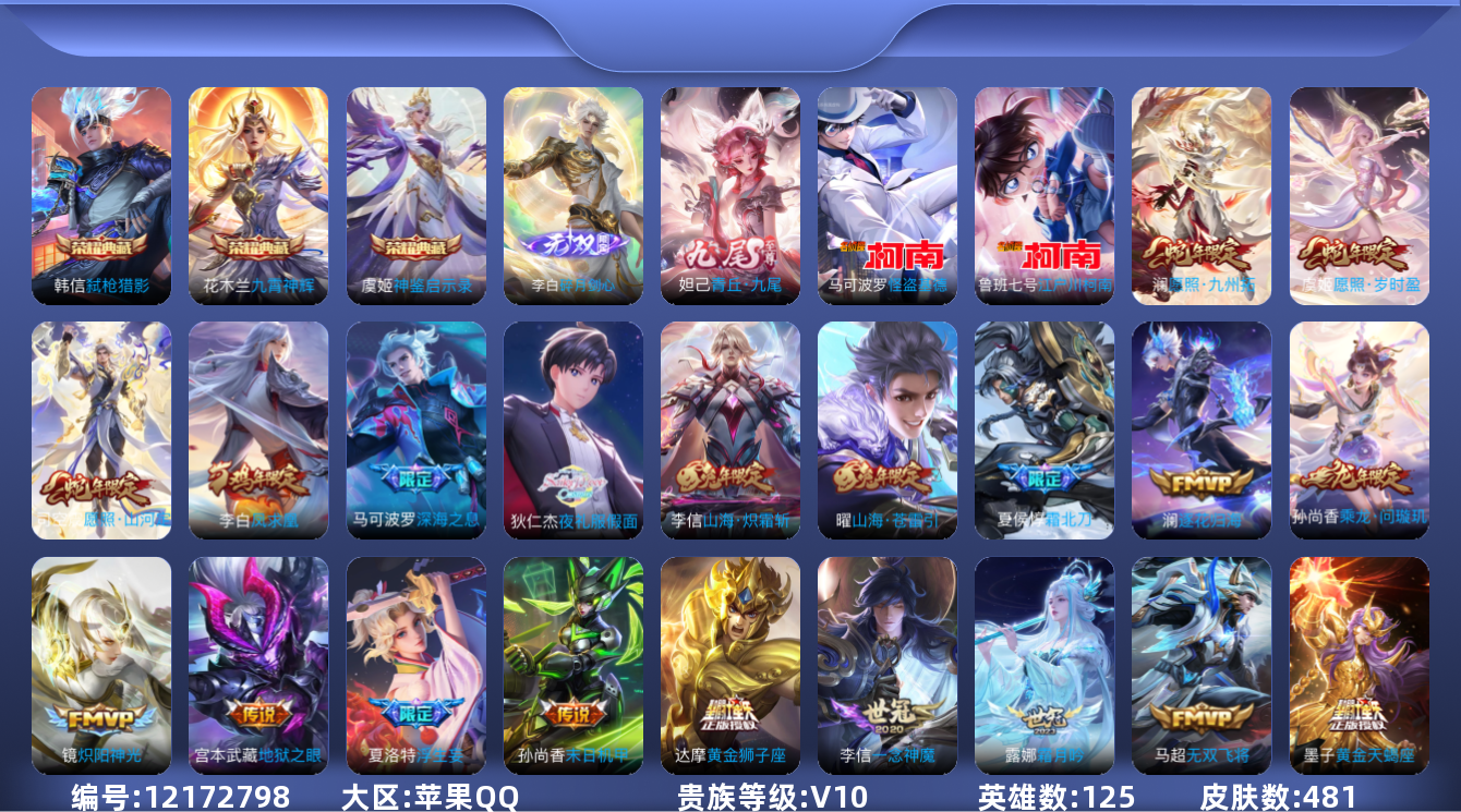 [12172798]V10 3典藏 2无双 2珍品传说 54传说 125英雄 481皮肤 可修改实名 百里守约小国标 黄忠小国标 狄仁杰小国标 苍小国标 虞姬小国标 戈娅小国标 莱西奥小国标 钟馗小国标 优装备:九霄神辉(木兰典藏),弑枪猎影(韩信典藏),青丘·九尾(妲己无双),碎月剑心(李白无双),神鉴启示录,江户川柯南,怪盗基德,黄金狮子座,云鹰飞将(小将军),绛天战甲(鸡嘴战神),黄金白羊座,猫影幻舞,久胜战神,炽阳神光,一念神魔,云霓雀翎,末日机甲-孙尚香(绿蚂蚱),零号·赤焰,地狱之眼,胖达荣荣,乞巧织情,时之恋人-刘备(电焊工),超时空战士-狄仁杰,无双飞将,碎云,天秀幻梦,山海·炽霜斩(李信年限),山海·苍雷引(电光曜子),画中仙,浮生妄,记忆之芯(机甲兔),青丘·九尾,电玩·雷克斯,妄想实况,妄想奇谈,惊梅引,遇见神鼓,夜礼服假面,小动物乐团,霜月吟,澜逐花归海,艾琳觅芳踪,黄金天蝎座,涂山容容 传说皮:乘龙·问璇玑(孙尚香年限),典韦战鼓燎原,幻光神枪 珍宝阁皮:妄想食味,优雅恋人,女武神 限定皮:愿照·九州拓(澜年限),愿照·岁时盈(虞姬年限),愿照·山河定(司空震年限),逐霄战戟,映山客,陌上桑,鸣野蒿,夏侯惇霜北刀,至尊宝,凤求凰(白切鸡),凤凰于飞,前尘镜,魔法小厨娘,白晶晶,时雨天司(水龙头),神威(电光马子),飞衡(韩信年限),高山流水,诗剑行,齐天大圣,怒海麟威,五谷丰年,青龙志(铠年限),游园惊梦,梁祝,御风骁将(吕布年限),龙胆,烈魂,李小龙,逐梦之影,玄武志(苏烈年限),朱雀志(守约年限),如梦令-后羿,霸王别姬-虞姬,默契交锋-兰陵王,默契交锋-花木兰,孙行者,猪悟能,大圣娶亲,乒乒小将,戈雅时之祈愿-云中君,玉兔公主,无尽星芒,深海之息(深海大菠萝),枫霜尽,山海·玄木吟(马可年限),冰霜神祇 史诗皮:鸭鸭历险记-刘禅,器灵·浮梦炉,狼魂孤将,化蝶舞,灵蛊蚀心,星界战将,龙之律动,雪豹·霜爪,石田雨龙,怒海争锋,破空之剑,战舞者,东方月初,蒙犽顽岩魄,埋骨钱,海诺心动手记,琥珀纪元伽罗,蔬乡物语(鲁班七号),超元猎域,百相守梦-百里守约,星界特工,百相守梦-黄忠,遇见神鹿,紫霞仙子,苍穹之光,电玩小子(小书包),黄金分割率,特工魅影,千年之狐,永昼,江河有灵,匿光侦查者,末日机甲-莱西奥,鹤归松栖(赵怀真