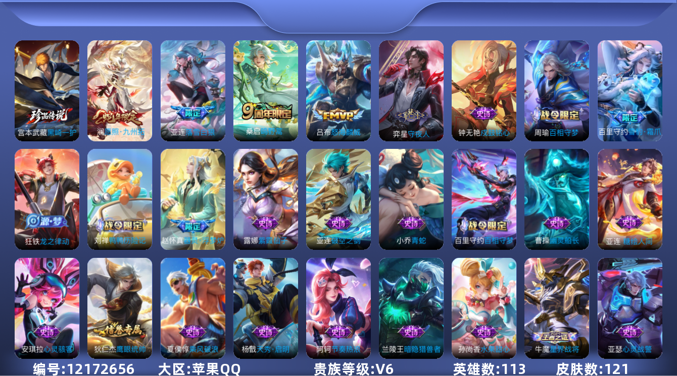[12172656]V6 1珍品传说 4传说 113英雄 121皮肤 可修改实名 优质装备:黑崎一护 传说皮:落雪白狼 限定皮:愿照·九州拓(澜年限),鸣野蒿,高山流水,怒海麟威 史诗皮:鸭鸭历险记-刘禅,器灵·浮梦炉,糖绘人间,星界战将,龙之律动,雪豹·霜爪,百相守梦-周瑜,戍鼓铭心,茶境仙,破空之剑,百相守梦-百里守约,守夜人,紫霞仙子,青蛇,节奏热浪,摇滚巨星,水果甜心,心灵骇客,暗隐猎兽者,幽灵船长,鬼剑武藏,心灵战警,天秀·启明,乘风破浪,圣诞狂欢,鹰眼统帅,魅力维加斯