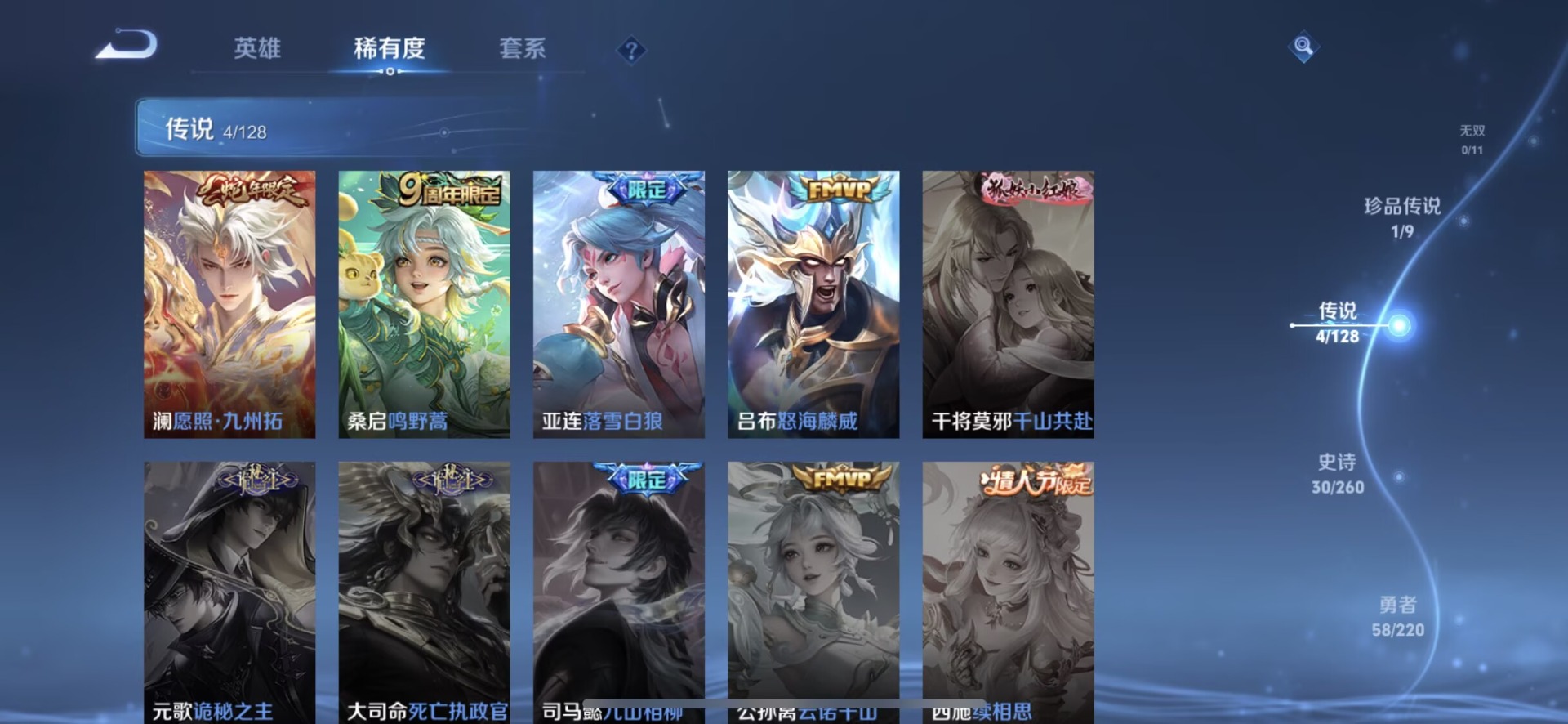 - PX_1988850-贵族4/皮肤133/传说3/史诗24/英雄122/蔷薇恋人/玩趣恶龙/特工战影/齐天大圣/桑启鸣野蒿/云缨幻光神枪/狄仁杰阴阳师/蔷薇恋人/庄周高山流水/玩趣恶龙/元歌无心/万华元夜/沙漠行僧/项羽海滩派对/醍醐杖/演武夺筹/金庭之子/齐天大圣/云中旅人/驱傩正仪/原初探秘者/鬼谷子五谷丰年/千军破阵/大漠名商/疑决卦/李小龙/擒涛扼浪/云中君纤云弄巧/梁祝/探海日志/海盐诗