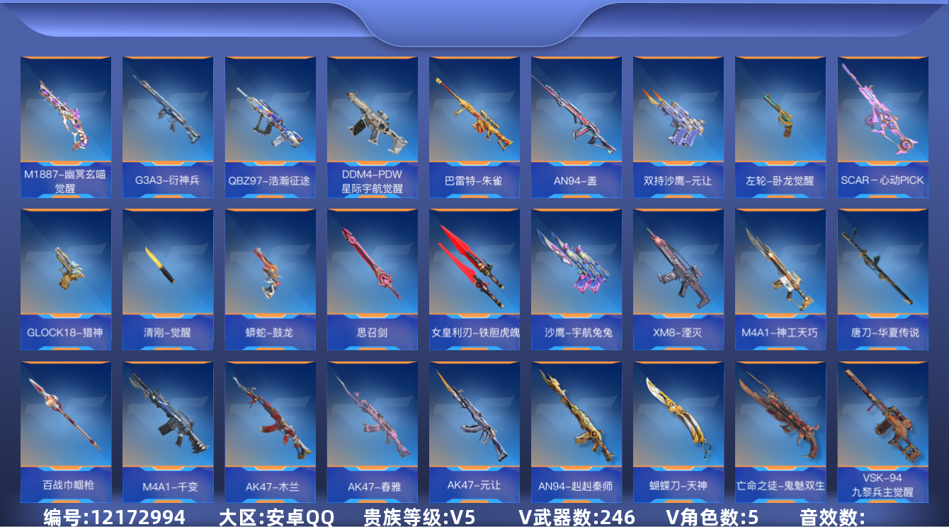 [12172994]V5 可二次 可修改实名 7王者武器 246英雄武器 5英雄角色 507万化 大师S 武器:王者之影,王者之心,王者幻神,王者之狱,王者之蝶,M12S-雷霆王者,M4A1-星象,M4A1-仲达,M200-幻神,TAC-慈,KSG-孟获,AK47-策,激昂霸王枪,王者之隐,COP 357-堕天神,COP 357-雷霆,AK47-火麒麟,AK47-无影,AK47-变色龙,M4A1-游骑兵,M4A1-黑龙,M4A1-黑骑士,M4A1-竞界荣光,M4A1-死神,M4A1-机械迷城,巴雷特-金色蔷薇,巴雷特-极光,巴雷特-雷霆,M4A1-堕天神,M4A1-冰锋觉醒,M4A1-哈迪斯,AK47-风神翼龙,AK47-木兰,刘易斯-天使,QBB95-极光,双持斯泰尔-天使,M12S-雷霆,亡命之徒-幻兽,AK47-Rush-星速,AK47-耀金伯爵,AK47-樱斗士-一觉,M4A1-龙血,M4A1-卧龙觉醒,M4A1-Rush-夜袭,巴雷特-冬灭觉醒,M4A1-海骑士,M4A1-千变,M4A1-运输船,M4A1-心动次元觉醒,AK47-春雅,AK47-血武士,AK47-华夏传说,AK47-黑鲨,AN94-超新星,剑齿虎,AWM-赛博时代,AWM-天龙,M200-心动次元觉醒,SCAR-幽暗骑士,SCAR-探星者,AK47-元让,SCAR-印刷术,MK47-鼓龙,汤姆逊-烈龙,CZS2-心动次元,QCW05-变形金刚·大黄蜂,PP19野牛-造纸术觉醒,寒霜烈龙,CBJ-MS-毒蜂,CZS2-血月,VSK-94-九黎兵主觉醒,地狱火,AA12-火药,地狱烈炎,KSG-火力竞放觉醒,M4A1-神工天巧,AN94-赳赳秦师,气手枪-炼狱,亡命之徒-鬼魅双生,M4A1-太白诗仙,墨刃-幻神,方天画戟,QSZ92-天使,改装GLOCK-木兰,沙鹰-宇航兔兔,气手枪-血月,毛瑟-毒蜂,沙鹰-冰锋觉醒,沙鹰-神兵修罗,MG36-幽暗骑士,QBB95-再战涿鹿,USP-太白诗仙,马来剑-毁灭,百战巾帼枪,神罚战斧,丛林匕首-庆龙觉醒,唐刀-大唐荣耀,唐刀-华夏传说,耀金雷刃,蝴蝶刀-天神,女皇利刃-铁胆虎魄,机械纪元手雷,AN94-盖,SCAR-心动PICK,XM8-湮灭,QBZ97-浩瀚征途,DDM4-PDW-星际宇航觉醒,GLOCK18-猎神,蟒蛇-鼓龙,左轮-卧龙觉醒,清刚-觉醒,炽芒蝶