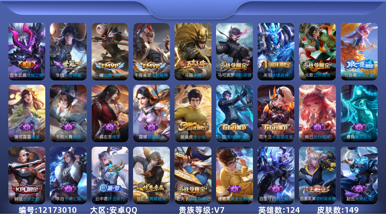 [12173010]V7 4传说 124英雄 149皮肤 可修改实名 优质装备:云鹰飞将(小将军),久胜战神,一念神魔,地狱之眼 珍宝阁皮:女武神 限定皮:神威(电光马子),冰锋战神,李小龙,逐梦之影,蜜橘之夏 史诗皮:紫霞仙子,苍穹之光,黄金分割率,特工魅影,千年之狐,魅语,晚萤,猫狗日记-孙策,乱世虎臣,修罗,女仆咖啡,水果甜心,绅士熊喵,功夫厨神,幽灵船长,纤云弄巧,逐浪之夏,水晶猎龙者,曙光守护者,金属风暴,原初追逐者,圣诞狂欢,圣诞恋歌,鹰眼统帅,魅力维加斯,未来纪元-赵云