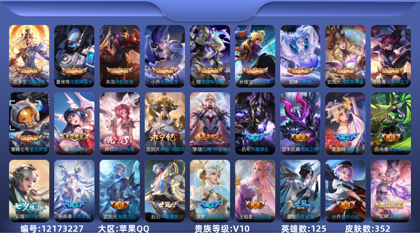 - [12139315]V10 4典藏 5无双 9珍品传说 59传说 125英雄 425皮肤 可修改实名 优质装备:星域神启(倪克斯贼亮),九霄神辉(木兰典藏),幻阙歌(貂蝉典藏),真我赫兹(瑶)(瑶无双),离恨烟(公孙离无双),拾光映像(瑶典藏),雪境奇遇-甄姬,器灵·螭龙剑,天机白泽,江户川柯南,怪盗基德,器灵·落星盏,酷洛米之心,大耳狗之梦,朽木白哉,黑崎一护,云鹰飞将(小将军),绛天战甲(鸡嘴战神),久胜战神,炽阳神光,一念神魔,音你心动-小乔,音你心动-周瑜,乞巧织情,淬星耀世,花朝如约(花篮子),挚爱之约,挚爱花嫁,无双飞将,山海·炽霜斩(李信年限),山海·琳琅生(小乔年限),炽翼辉光(娃娃菜牛角包),画中仙,浮生妄,鹤羽星尊,灼幽烈阳,妄想实况,惊梅引,鲁班七号-时之奇旅,永恒水手月亮,夜礼服假面,小动物乐团,霜月吟,澜逐花归海,艾琳觅芳踪,云中君群星魔术团,朵莉亚心动手记,牧神诗旅,玄雷天君,涂山容容 珍品传说:时之奇旅-孙策,兔狲·蓬尾 传说皮:乘龙·问璇玑(孙尚香年限),乘龙·铭钟鼎(赵云年限),乘龙·淬吴钩(孙策年限),死亡执政官,九山相柳,云诺千山,续相思,星之鸣奏,幻光神枪 珍宝阁皮:妄想食味,万物之道 限定皮:愿照·九州拓(澜年限),愿照·福禄聚(蔡文姬年限),愿照·岁时盈(虞姬年限),愿照·山河定(司空震年限),愿照·众生和(妲己年限),愿照·千秋盛(女娲年限),逐霄战戟,映山客,陌上桑,鸣野蒿,夏侯惇霜北刀,至尊宝,武陵仙君(小桃花),傲雪梅枪,寅虎·展翼(孙膑年限),前尘镜,星穹之声,魔法小厨娘,时雨天司(水龙头),玄嵩(庄周年限),山海·碧波行(瑶年限),至美·乘鲤谣,诗剑行,怒海麟威,五谷丰年,天狼运算者,梁祝,龙胆,天狼溯光者,默契交锋-花木兰,寅虎·心曲(虎婆),时之祈愿-瑶(瑶传限),百木心枪,神器·万象笔,梦圆繁星,山海·玄木吟(马可年限) 史诗皮:鸭鸭历险记-刘禅,飞车小橘子,器灵·浮梦炉,化蝶舞,星界战将,谪仙醉月,龙之律动,雪豹·霜爪,藏狐·褐绒,布丁狗之誓,小牛鸭,石田雨龙,百相守梦-周瑜,茶境仙,幻珠鲛人,炽弈燎原,撼地雄心,破空之剑,战舞者,涂山红红,东方月初,蒙犽顽岩魄,埋骨钱,芈月浮光幕影,海诺心动手记,上官婉儿群星魔术团,奇遇星旅,蔬乡物语(鲁班七号),曹操夜都魔契,乘龙·聚宝船(安琪拉年限),乘龙·忆丹青(大乔年限),百