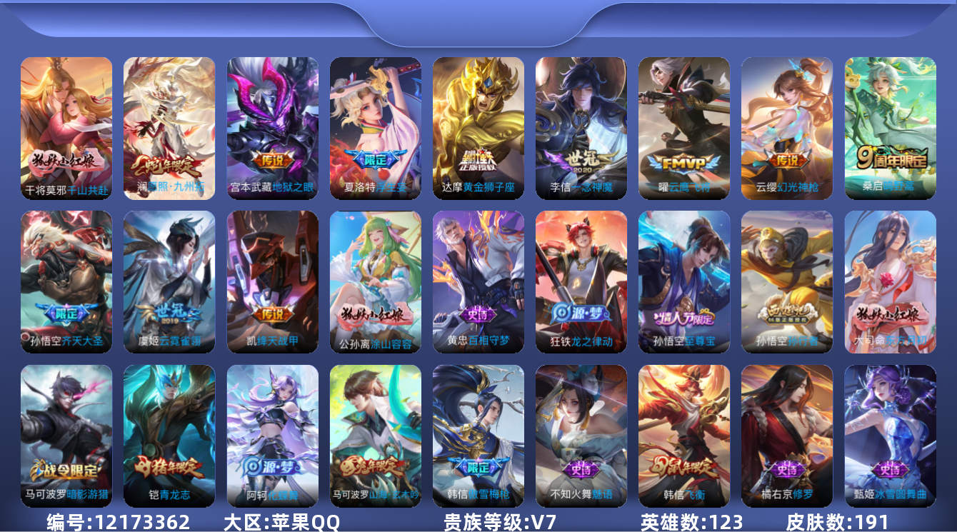 [12173362]V7 12传说 123英雄 191皮肤 可修改实名 优质装备:黄金狮子座,云鹰飞将(小将军),绛天战甲(鸡嘴战神),一念神魔,云霓雀翎,地狱之眼,浮生妄,千山共赴,涂山容容 传说皮:幻光神枪 珍宝阁皮:万物之道,蔷薇恋人 限定皮:愿照·九州拓(澜年限),逐霄战戟,鸣野蒿,至尊宝,傲雪梅枪,飞衡(韩信年限),高山流水,齐天大圣,五谷丰年,青龙志(铠年限),孙行者,百木心枪,山海·玄木吟(马可年限) 史诗皮:化蝶舞,谪仙醉月,龙之律动,茶境仙,破空之剑,东方月初,百相守梦-百里守约,百相守梦-黄忠,紫霞仙子,特工魅影,千年之狐,魅语,冰冠公主,偶像歌手,乱世虎臣,节奏热浪,修罗,水果甜心,星夜王子,心灵骇客,功夫厨神,德古拉伯爵,暗隐猎兽者,幽灵船长,鬼剑武藏,天秀·启明,拒霜思,缤纷独角兽,逐浪之夏,水晶猎龙者,曙光守护者,金属风暴,原初追逐者,圣诞恋歌,鹰眼统帅,魅力维加斯,未来纪元-赵云