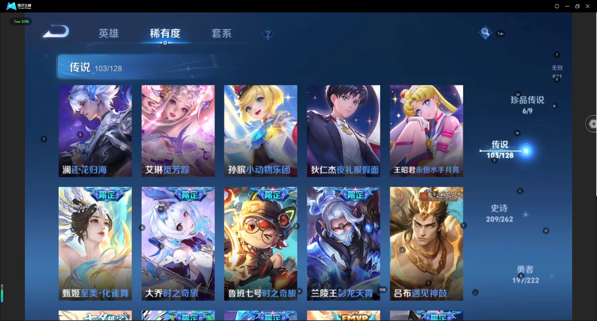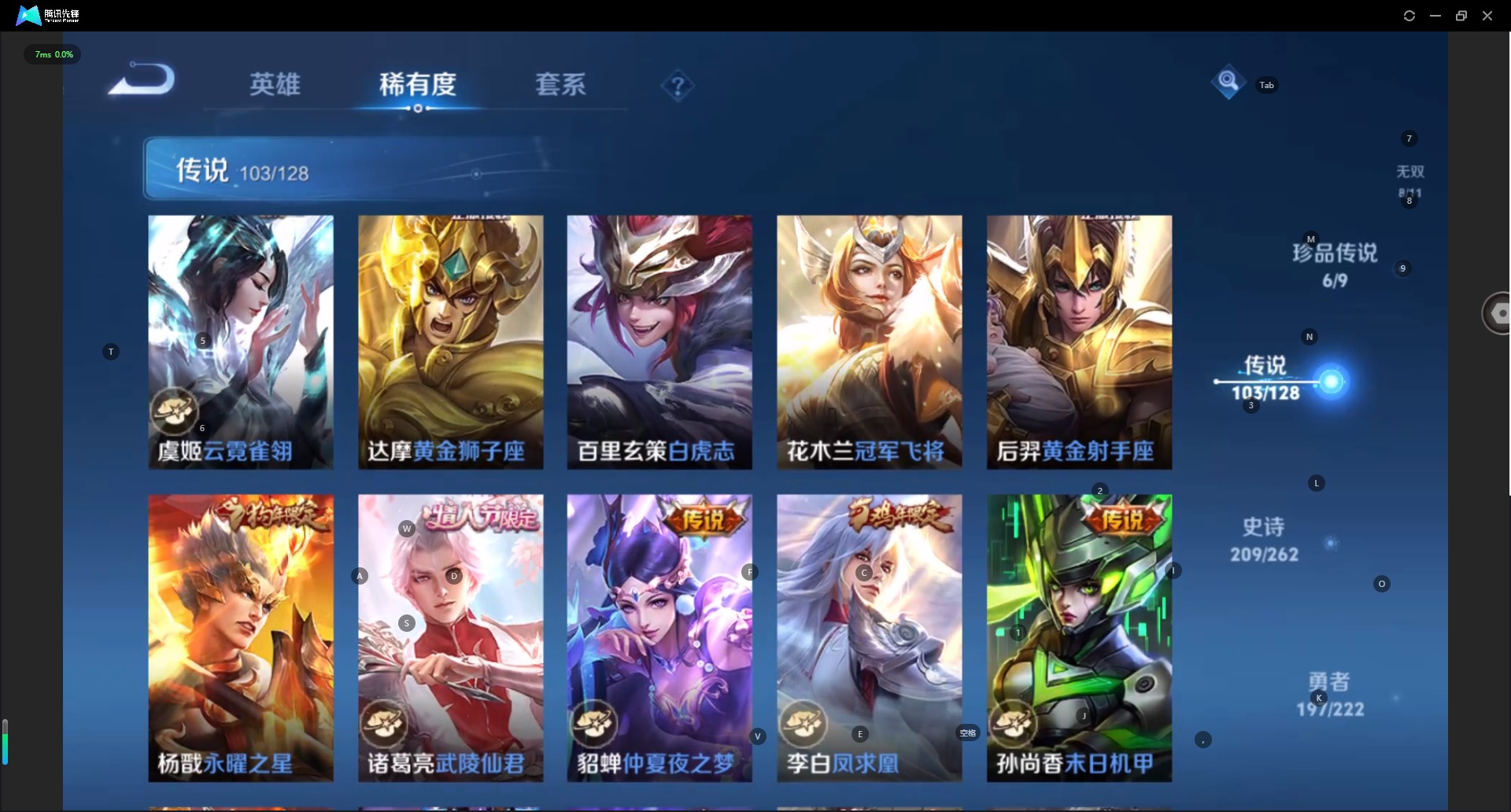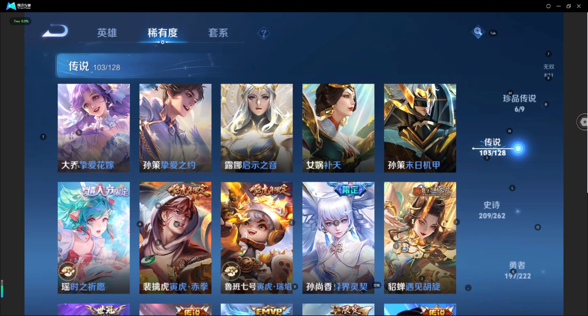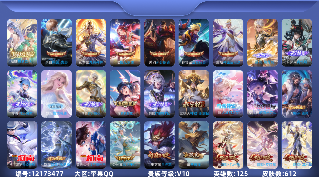 - [11883803]V7 1典藏 1珍品传说 11传说 124英雄 198皮肤 可修改实名 优质装备:神鉴启示录,器灵·落星盏,黄金狮子座,超时空战士-狄仁杰,浮生妄,百相守梦(张飞),霜月吟 珍宝阁皮:妄想食味 限定皮:愿照·岁时盈(虞姬年限),愿照·山河定(司空震年限),愿照·千秋盛(女娲年限),映山客,鸣野蒿,太华(伽罗年限),李小龙,寅虎·心曲(虎婆),神器·万象笔,山海·玄木吟(马可年限) 史诗皮:器灵·浮梦炉,化蝶舞,星界战将,龙之律动,石田雨龙,茶境仙,破空之剑,蒙犽顽岩魄,海诺心动手记,夜落电台,乘龙·聚宝船(安琪拉年限),百相守梦-黄忠,织梦人,遇见神鹿,特工魅影,真我赫兹(百里守约),闲日渔趣,蒙恬荣光圣徽,冰冠公主,偶像歌手,白蛇,电玩·兔顽号,电玩·爆裂旋风,银翎春语,龙骑士(小龙虾),末日机甲-吕布,猫狗日记-孙策,猫狗日记-大乔,乱世虎臣,摇滚巨星,水果甜心,时之奇旅-安琪拉,德古拉伯爵,幽灵船长,鬼剑武藏,心灵战警,乐园奇幻夜,舞动绿茵,乘风破浪,逐浪之夏,金属风暴,鹰眼统帅,魅力维加斯,滕王阁序,千筹问战
