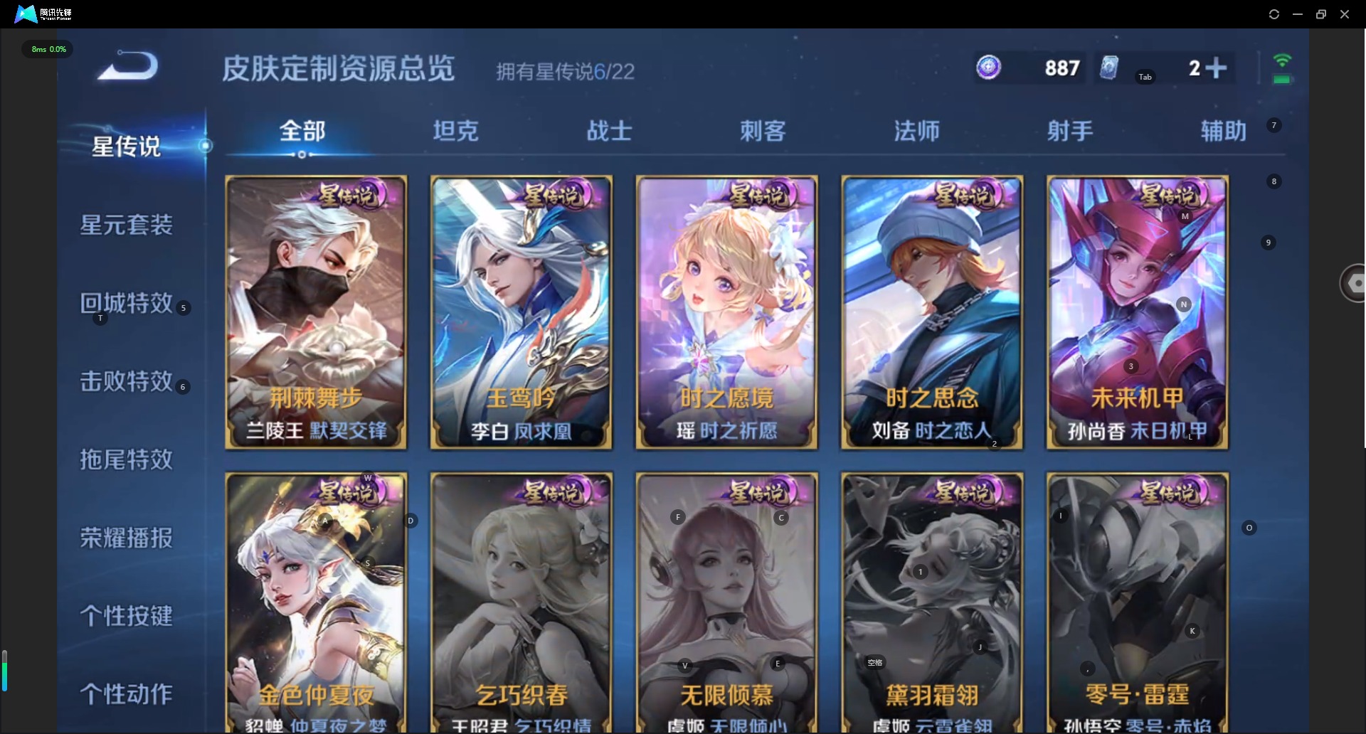 高渐离天秀·音浪,高渐离燃音魔法,夏侯惇乘风破浪,刘备百相守梦,曹操幽灵船长,曹操夜都魔契,小乔缤纷独角兽,小乔青蛇,阿古朵顽趣,不知火舞魅语,赵怀真鹤归松栖,赵怀真器灵·浮梦炉,项羽苍穹之光,露娜紫霞仙子,庄周天秀·幻梦,镜玫瑰异探,周瑜雪夜绮愿,诸葛亮黄金分割率,宫本武藏鬼剑武藏,杨玉环银翎春语,貂蝉圣诞恋歌,貂蝉唤灵魅影,花木兰水晶猎龙者,蒙犽百解令,杨戬天秀·启明,张良千筹问战,嬴政摇滚巨星,嬴政暗夜贵公子,雅典娜冰冠公主,雅典娜黎明之约,韩信白龙吟,百里守约特工魅影,墨子龙骑士,墨子金属风暴,澜赏金猎手,王昭君偶像歌手,嫦娥拒霜思,橘右京修罗,大乔白蛇,大乔猫狗日记,大乔乘龙·忆丹青,刘邦德古拉伯爵,阿轲暗夜猫娘,阿轲节奏热浪,沈梦溪匿光破解者,铠曙光守护者,伽罗箭羽风息,廉颇地狱岩魂,伽罗琥珀纪元,孙策猫狗日记,鲁班七号电玩小子,吕布圣诞狂欢,吕布末日机甲,刘禅电玩·爆裂旋风,刘禅天才门将,刘禅绅士熊喵,公孙离无限星赏官,亚连糖绘人间,兰陵王暗隐猎兽者,苍狼魂孤将,夏洛特永昼,李白千年之狐,安琪拉心灵骇客,安琪拉乘龙·聚宝船,安琪拉时之奇旅,艾琳奇遇舞章,西施诗语江南,白起星夜王子,亚瑟心灵战警,狄仁杰绮世丹青,莱西奥末日机甲,程咬金功夫厨神,百里玄策原初追逐者,李元芳匿光侦查者,李元芳逐浪之夏,蔡文姬舞动绿茵,瑶遇见神鹿,蔡文姬电玩·兔顽号,弈星滕王阁序,娜可露露晚萤,钟馗乐园奇幻夜,关羽百相守梦,关羽决胜骁骑