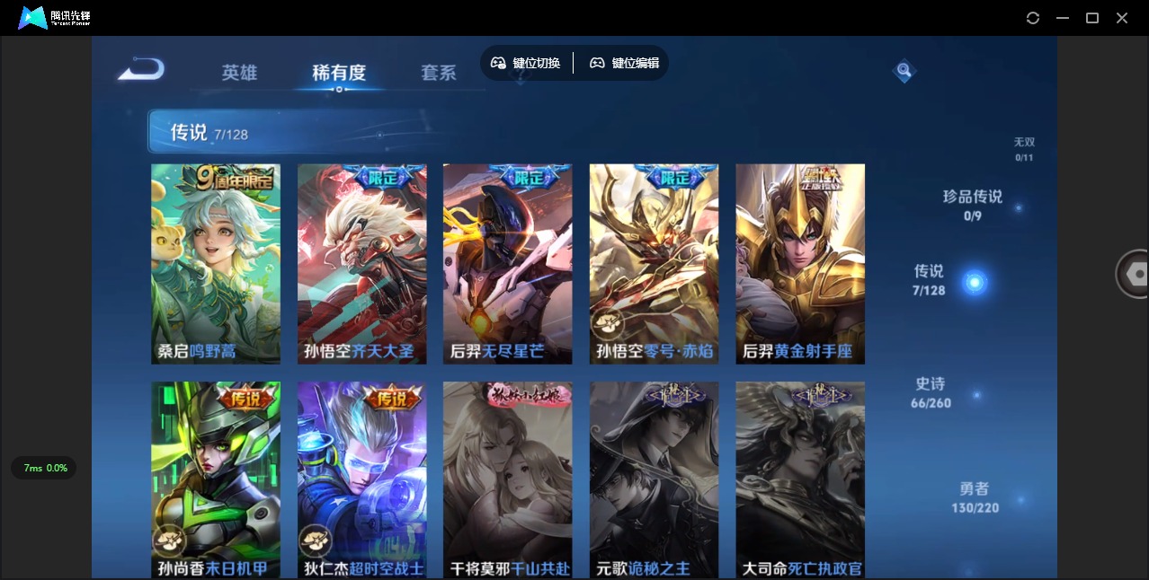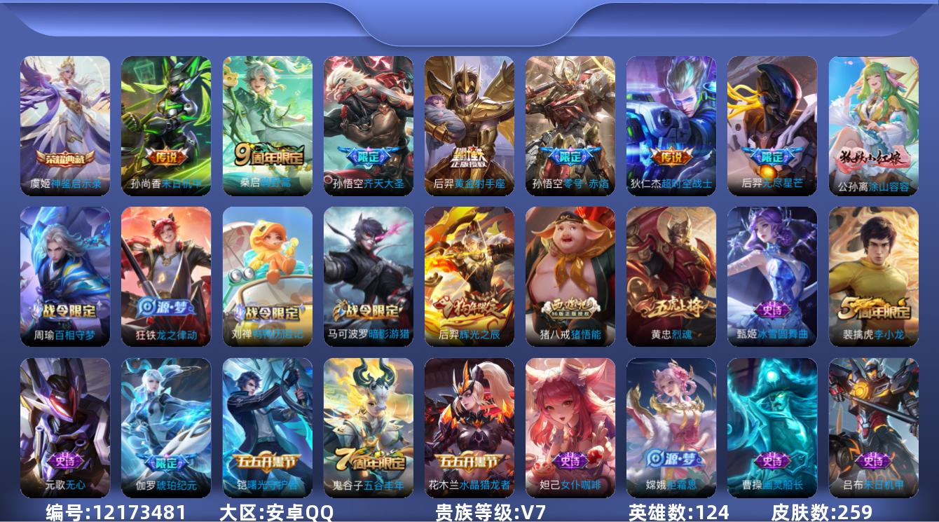 - [11605695]V7 1典藏 1珍品传说 12传说 125英雄 339皮肤 可修改实名 优质装备:鸣剑·曳影,怪盗基德,黄金射手座,云鹰飞将(小将军),黄金白羊座,久胜战神,一念神魔,淬星耀世,超时空战士-狄仁杰,山海·炽霜斩(李信年限) 珍宝阁皮:胡桃夹子,优雅恋人,蔷薇恋人 限定皮:愿照·岁时盈(虞姬年限),逐霄战戟,鸣野蒿,至尊宝,魔法小厨娘,时雨天司(水龙头),遇见飞天,高山流水,怒海麟威,降魔,五谷丰年,梁祝,逐梦之音,李小龙,孙行者,神器·万象笔,山海·玄木吟(马可年限) 史诗皮:鸭鸭历险记-刘禅,器灵·浮梦炉,化蝶舞,星界战将,龙之律动,茶境仙,怒海争锋,蒙犽顽岩魄,上官婉儿群星魔术团,蔬乡物语(鲁班七号),百相守梦-黄忠,织梦人,黄金分割率,特工魅影,千年之狐,江河有灵,魅语,百解令(蒙犽),高渐离燃音魔法,蒙恬荣光圣徽,冰冠公主,偶像歌手,电玩·爆裂旋风,百相守梦(刘备),龙骑士(小龙虾),末日机甲-吕布,猫狗日记-孙策,乱世虎臣,节奏热浪,修罗,女仆咖啡,摇滚巨星,水果甜心,绅士熊喵,星夜王子,心灵骇客,功夫厨神,德古拉伯爵,暗隐猎兽者,幽灵船长,鬼剑武藏,心灵战警,地狱岩魂,纤云弄巧,拒霜思,乘风破浪,逐浪之夏,水晶猎龙者,曙光守护者,热力回旋,箭羽风息,金属风暴,原初追逐者,圣诞狂欢,圣诞恋歌,鹰眼统帅,王者之锤,魅力维加斯,黎明之约,赏金猎手,无心,未来纪元-赵云
