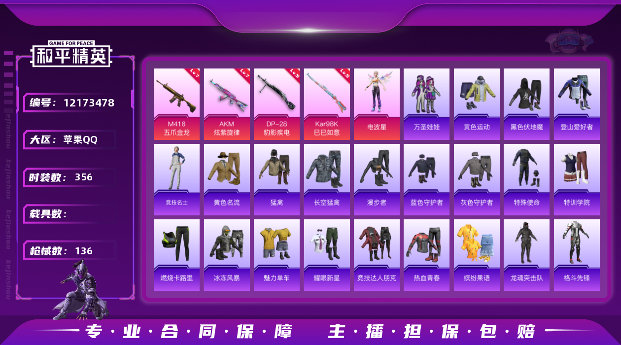 - PX_2102245- 安卓手Q-7王牌印记-5粉装-5特效枪-1载具-48652热力值-109套装-156枪皮-0卓越印记-0传奇印记 【5粉装】,缤纷油彩,恐龙拽拽,极致幻想,金属狂野,莲影清波 【5特效枪】AKM-炫紫旋律-6级 SCAR-L-锦绣绵绵-5级 M416-心之恋语-7级 M416-风花雪月-1级 Kar98K-巳巳如意-3级 【2稀有紫装】,龟仙人,金羽特工, 【1稀有载具】