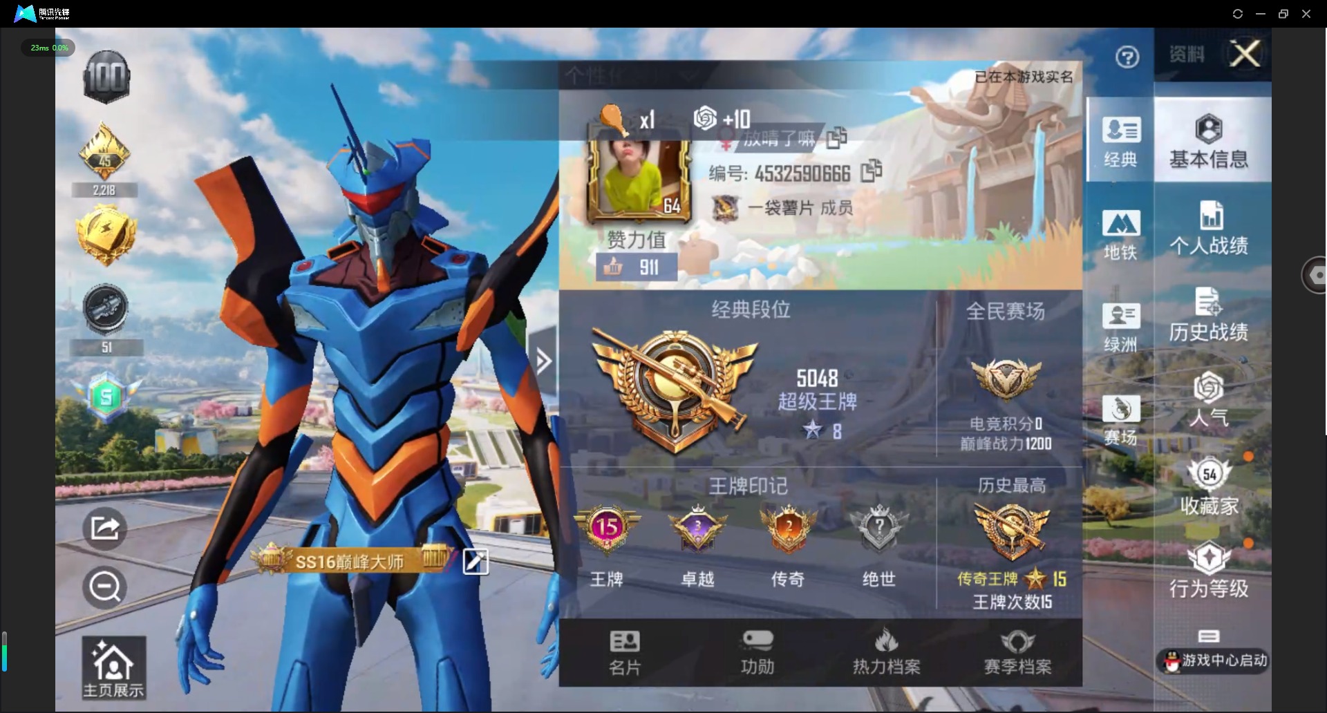 - PX_2078933-【金标莱西奥】实名: 可修改 贵族等级: V5 英雄数: 103 皮肤数: 91 珍品传说: 怪盗基德 传说皮: 胖达荣荣,幻光神枪 限定皮: 鸣野蒿,愿照·九州拓