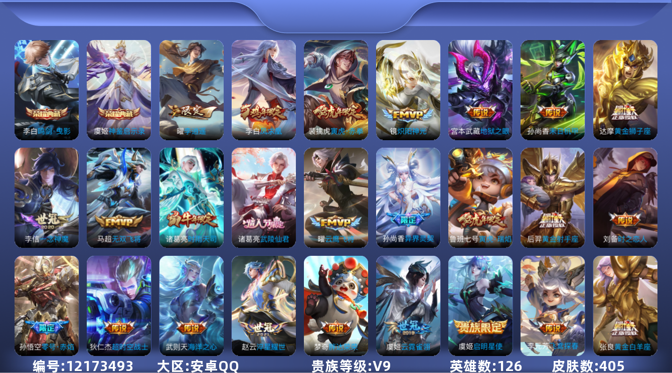 [12173493]V9 2典藏 26传说 126英雄 405皮肤 典藏英雄武则天 可修改实名 优质装备:鸣剑·曳影,神鉴启示录,黄金狮子座,黄金射手座,云鹰飞将(小将军),绛天战甲(鸡嘴战神),黄金白羊座,炽阳神光,一念神魔,云霓雀翎,末日机甲-孙尚香(绿蚂蚱),零号·赤焰,海洋之心,地狱之眼,飞鸢探春,胖达荣荣,李逍遥,时之恋人-刘备(电焊工),淬星耀世,超时空战士-狄仁杰,无双飞将 珍宝阁皮:万物之道,优雅恋人,女武神 限定皮:至尊宝,凤求凰(白切鸡),武陵仙君(小桃花),异界灵契(白毛香),傲雪梅枪,寅虎·展翼(孙膑年限),时雨天司(水龙头),神威(电光马子),瑞麟志(木兰年限),遇见飞天,高山流水,五谷丰年,青龙志(铠年限),冰锋战神,天狼运算者,游园惊梦,梁祝,龙胆,烈魂,李小龙,逐梦之光,如梦令-后羿,霸王别姬-虞姬,孙行者,猪悟能,大圣娶亲,青春决赛季,冰霜恋舞曲,蜜橘之夏,匿光追影者,女儿国国王,寅虎·御盾(廉颇年限),寅虎·瑞焰(虎皮蛋子),寅虎·心曲(虎婆),寅虎·赤拳(老虎年限),百木心枪,玉兔公主,山海·玄木吟(马可年限) 史诗皮:鸭鸭历险记-刘禅,化蝶舞,灵蛊蚀心,星界战将,龙之律动,石田雨龙,茶境仙,百相守梦-黄忠,紫霞仙子,苍穹之光,白龙吟,黄金分割率,特工魅影,千年之狐,魅语,百解令(蒙犽),蒙恬荣光圣徽,冰冠公主,偶像歌手,晚萤,暗夜猫娘,龙骑士(小龙虾),末日机甲-吕布,猫狗日记-孙策,猫狗日记-大乔,乱世虎臣,节奏热浪,修罗,女仆咖啡,摇滚巨星,水果甜心,绅士熊喵,天才门将,星夜王子,心灵骇客,时之奇旅-安琪拉,功夫厨神,德古拉伯爵,暗隐猎兽者,幽灵船长,鬼剑武藏,暗渊魔法,心灵战警,乐园奇幻夜,舞动绿茵,地狱岩魂,纤云弄巧,繁星吟游(呼啦呼啦),拒霜思,缤纷独角兽,乘风破浪,逐浪之夏,水晶猎龙者,曙光守护者,箭羽风息,金属风暴,原初追逐者,圣诞狂欢,圣诞恋歌,鹰眼统帅,王者之锤,暗夜贵公子,魅力维加斯,黎明之约,赏金猎手,寅虎·御盾,无心,未来纪元-赵云