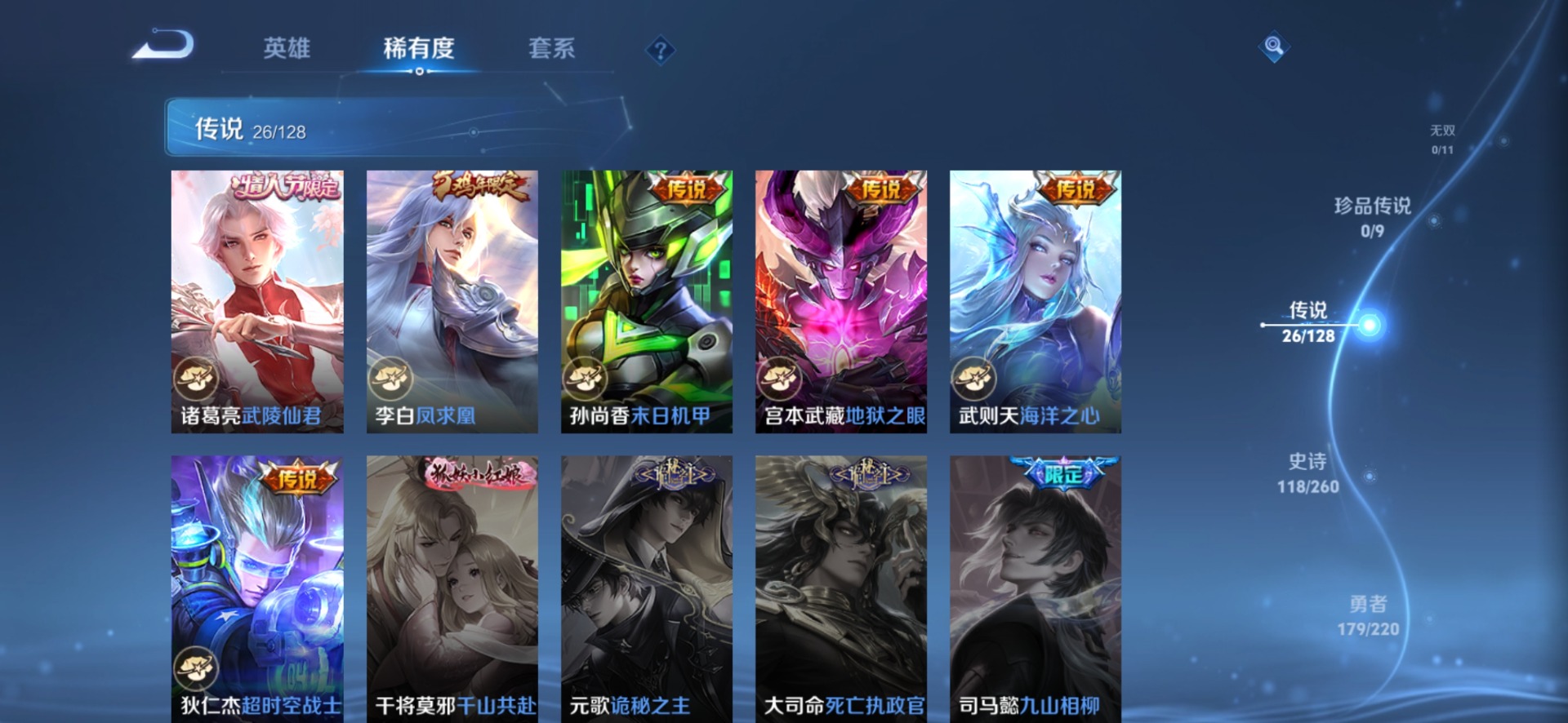 刘邦夺宝奇兵,夏侯惇朔风刀,老夫子醍醐杖,沈梦溪大漠名商,盾山御銮,曹操烛龙,孙膑妖精王,苏烈千军破阵,典韦穷奇,典韦蓝屏警告,达摩沙漠行僧,牛魔御旌,吕布猎兽之王,庄周蜃楼王,元歌云间偶戏,兰陵王金庭之子,裴擒虎擒涛扼浪,鲁班大师探海日志,明世隐疑决卦,蒙犽狂想玩偶喵,马可波罗暗影游猎,白起狰,亚瑟狮心王,鬼谷子原初探秘者,张良古海寻踪,女娲朔望之晖,桑启海盐诗旅,狄仁杰万华元夜,嬴政白昼王子,芈月重明,程咬金演武夺筹,扁鹊炼金王,李元芳云中旅人,弈星混沌棋,虞姬凯尔特女王,米莱狄御霄,钟馗神迹守卫,钟馗驱傩正仪,狂铁御狮,太乙真人饕餮