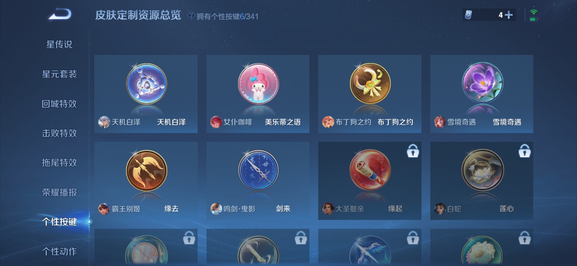 黄忠烈魂,甄姬女儿国国王,铠青龙志,廉颇寅虎·御盾,赵云百木心枪,赵云龙胆,孙膑天狼运算者,孙膑寅虎·展翼,干将莫邪冰霜恋舞曲,孙尚香异界灵契,鲁班七号寅虎·瑞焰,后羿如梦令,镜匿光追影者,诸葛亮时雨天司,杨玉环寅虎·心曲,公孙离玉兔公主,公孙离蜜橘之夏,裴擒虎李小龙,裴擒虎寅虎·赤拳,东皇太一逐梦之光,上官婉儿梁祝,花木兰瑞麟志,花木兰青春决赛季,马可波罗山海·玄木吟,猪八戒猪悟能,孙悟空孙行者,孙悟空大圣娶亲,孙悟空至尊宝,马超神威,韩信傲雪梅枪,虞姬霸王别姬,关羽冰锋战神