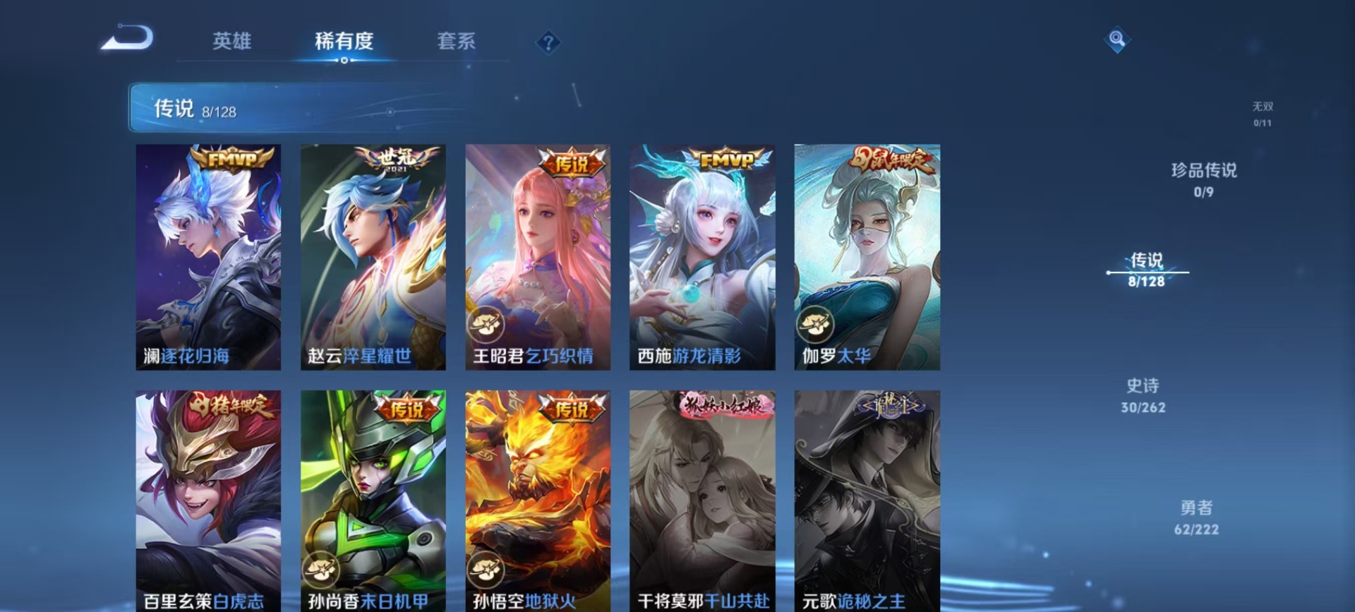 曹操天狼征服者,伽罗天狼溯光者,伽罗太华,后羿辉光之辰,裴擒虎李小龙,上官婉儿梁祝,孙悟空大圣娶亲,百里玄策白虎志,韩信飞衡