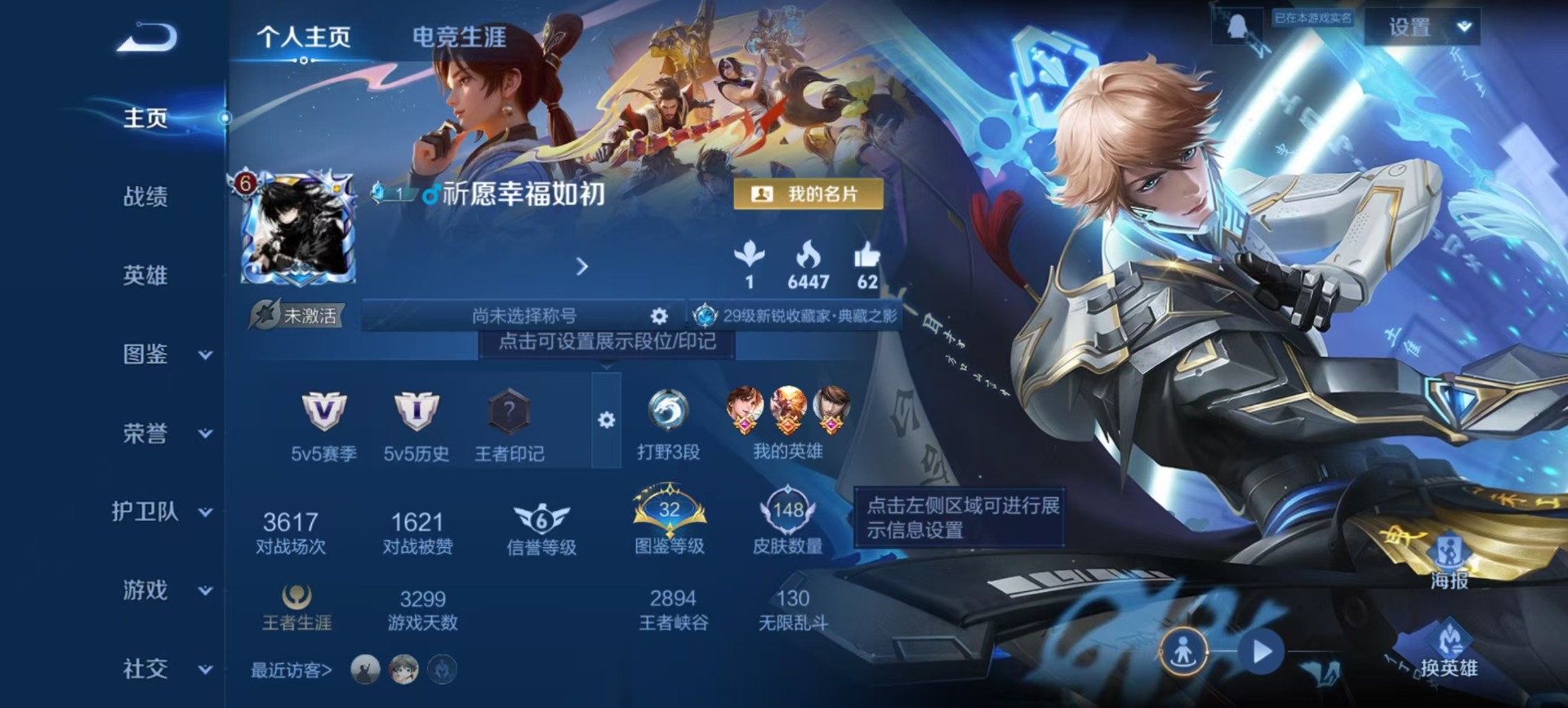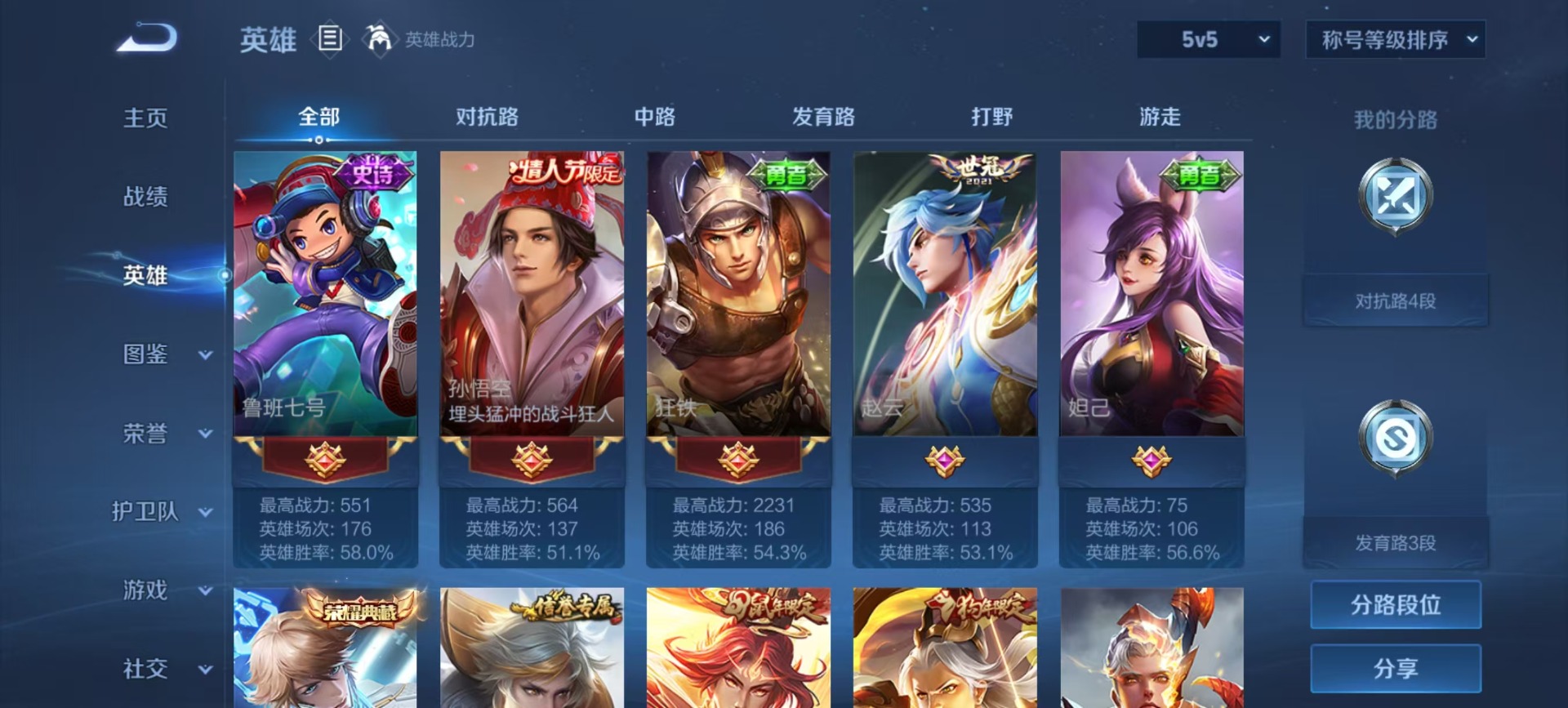 - PX_2095052-实名: 可修改 贵族等级: V5 英雄数: 124 皮肤数: 138 星传说: 星际治安官 传说皮: 黄金白羊座,超时空战士-狄仁杰,澜逐花归海,典韦战鼓燎原,云诺千山 限定皮: 鸣野蒿,陌上桑,愿照·九州拓