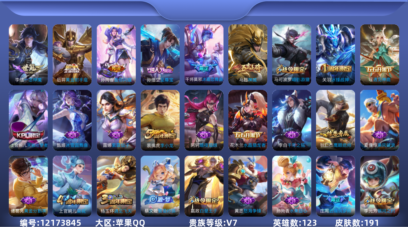 - PX_2109945-0【秒换绑,无需等三天】V7-207皮肤 9印记 打野36段 金标娜可露露 银标刘备 镜 吕布 曜 百里玄策 1星元金色仲夏夜 苹果Q-V-207皮肤-1典藏 17传说 -1典藏(已兑换) 银白咏叹调 凤求凰 神威 鹤羽星尊 冰封战神 白虎志 朱雀志 祈雪灵祝 御风骁将 武圣 李逍遥 逐梦之星 天狼运算者 天狼溯光者 霸王别姬男 默契交锋男 大圣娶亲 蜜橘之夏 冰霜恋舞曲