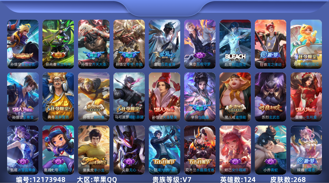 [12173948]V7 1典藏 4传说 124英雄 268皮肤 可修改实名 优质装备:全息碎影(猴子典藏),云霓雀翎,末日机甲-孙尚香(绿蚂蚱),零号·赤焰 珍宝阁皮:玩趣恶龙 限定皮:逐霄战戟,至尊宝,白晶晶,遇见飞天,高山流水,齐天大圣,游园惊梦,梁祝,李小龙,逐梦之光,玄武志(苏烈年限),孙行者,猪悟能,一生所爱,大圣娶亲,美猴王 史诗皮:鸭鸭历险记-刘禅,龙之律动,石田雨龙,百相守梦-黄忠,苍穹之光,电玩小子(小书包),黄金分割率,特工魅影,白蛇,江河有灵,青蛇,百解令(蒙犽),偶像歌手,完美假期,猫狗日记-孙策,乱世虎臣,节奏热浪,女仆咖啡,水果甜心,星夜王子,心灵骇客,功夫厨神,暗隐猎兽者,幽灵船长,鬼剑武藏,地狱岩魂,诗语江南,繁星吟游(呼啦呼啦),拒霜思,缤纷独角兽,乘风破浪,逐浪之夏,水晶猎龙者,曙光守护者,箭羽风息,金属风暴,圣诞狂欢,圣诞恋歌,鹰眼统帅,魅力维加斯,无心,未来纪元-赵云