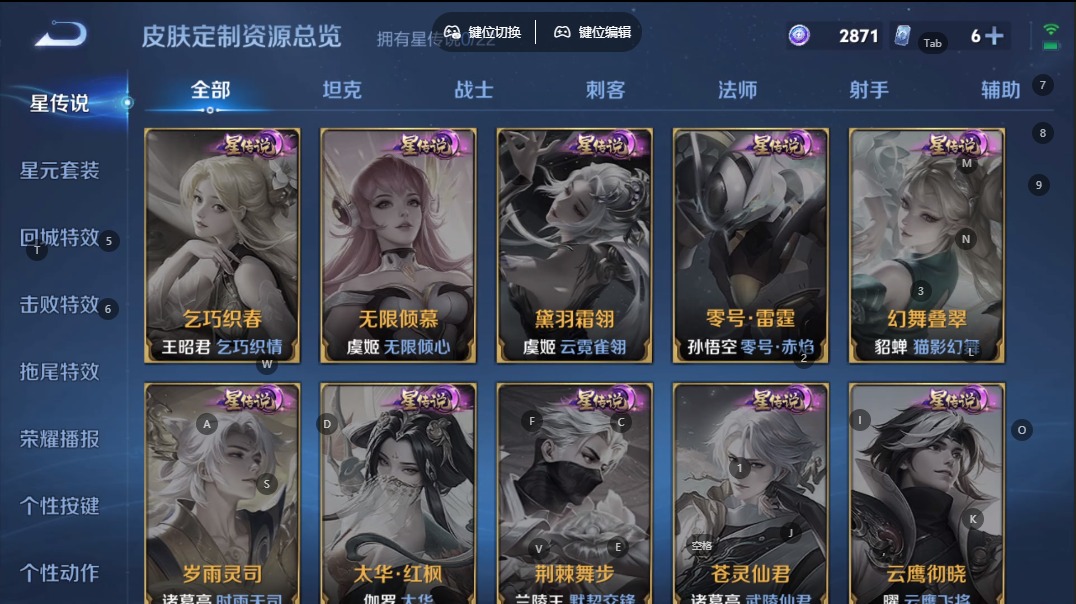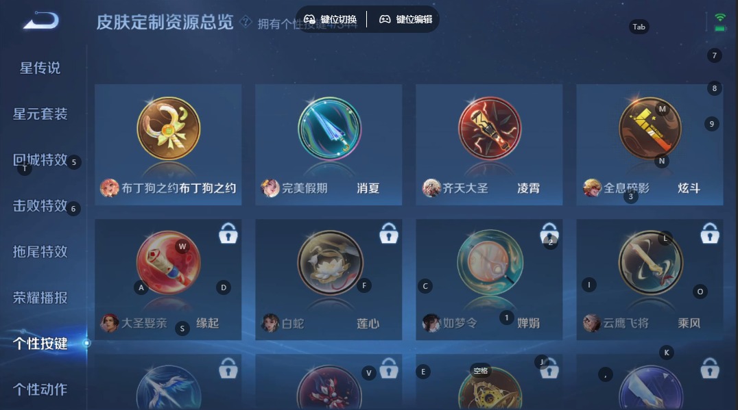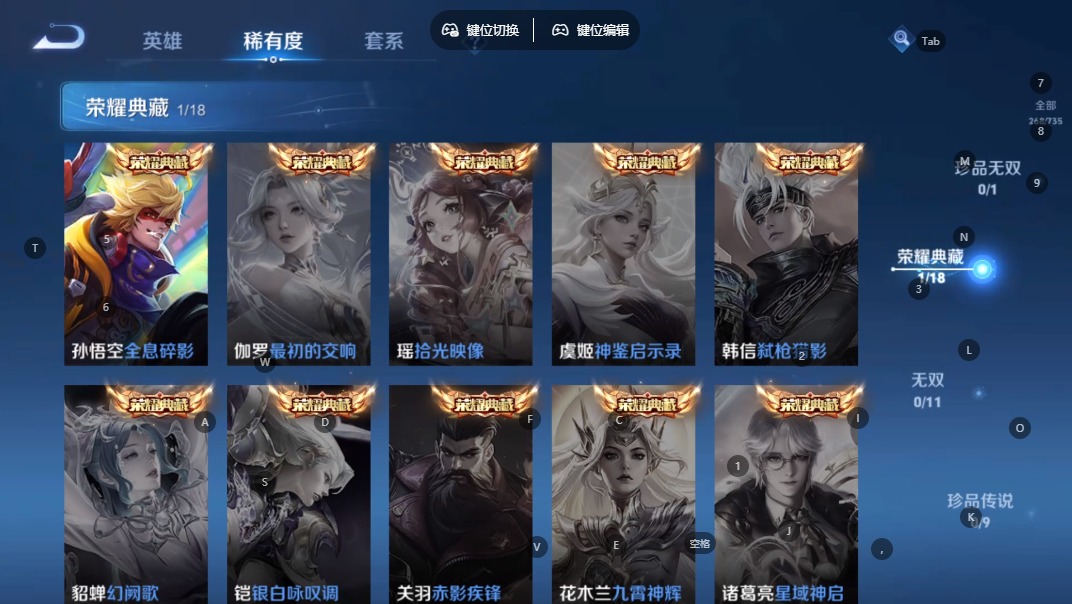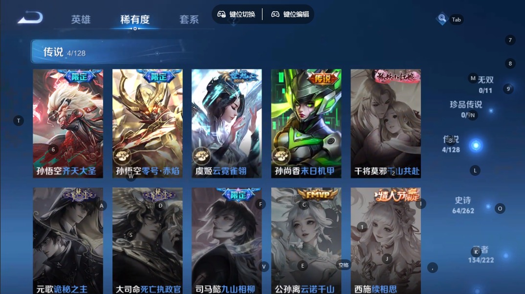 苏烈玄武志,露娜一生所爱,裴擒虎李小龙,东皇太一逐梦之光,上官婉儿梁祝,猪八戒猪悟能,孙悟空孙行者,孙悟空大圣娶亲,芈月白晶晶,孙悟空至尊宝,孙悟空美猴王