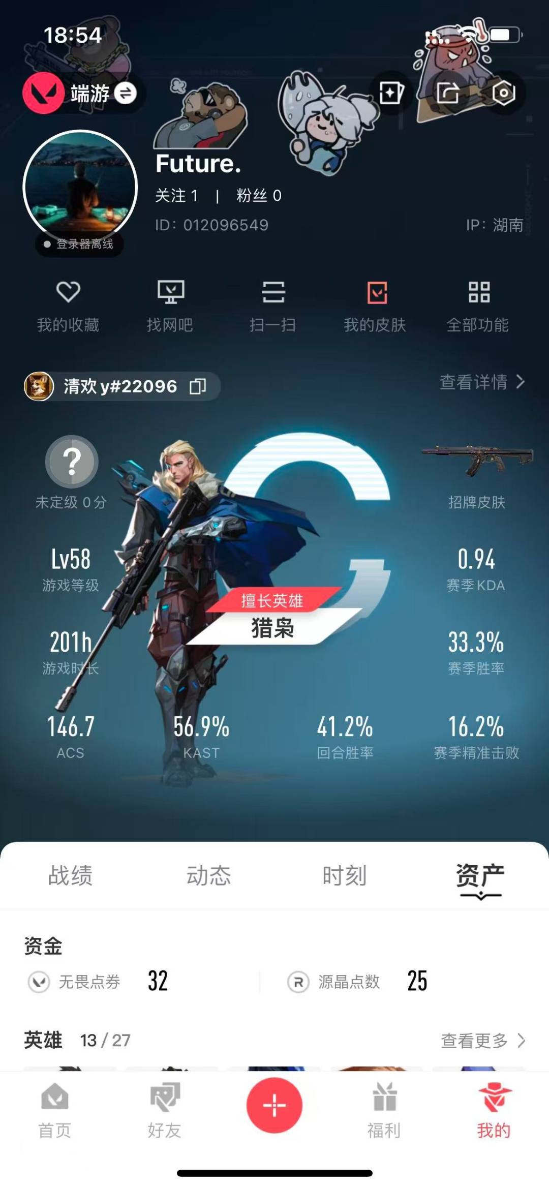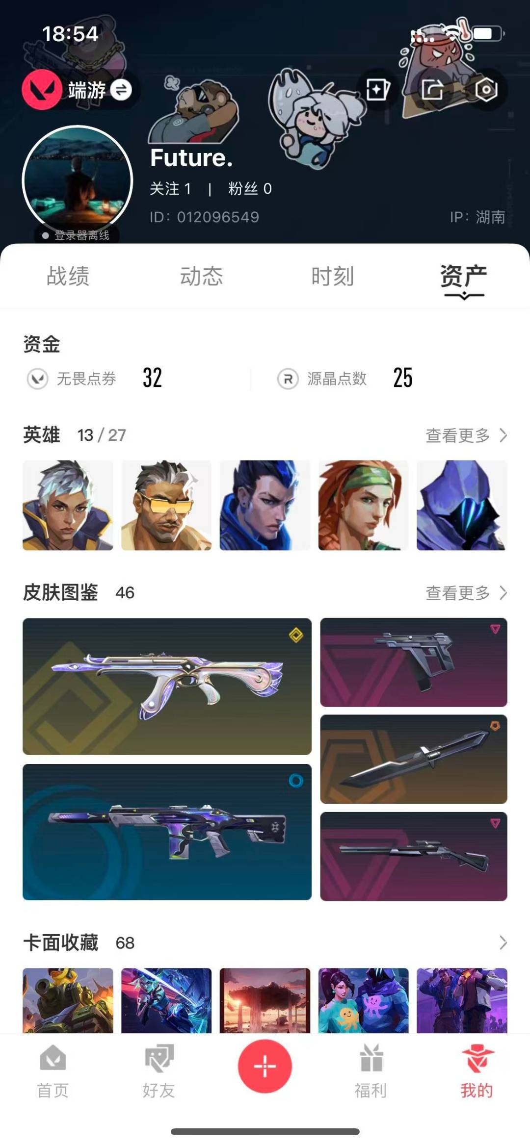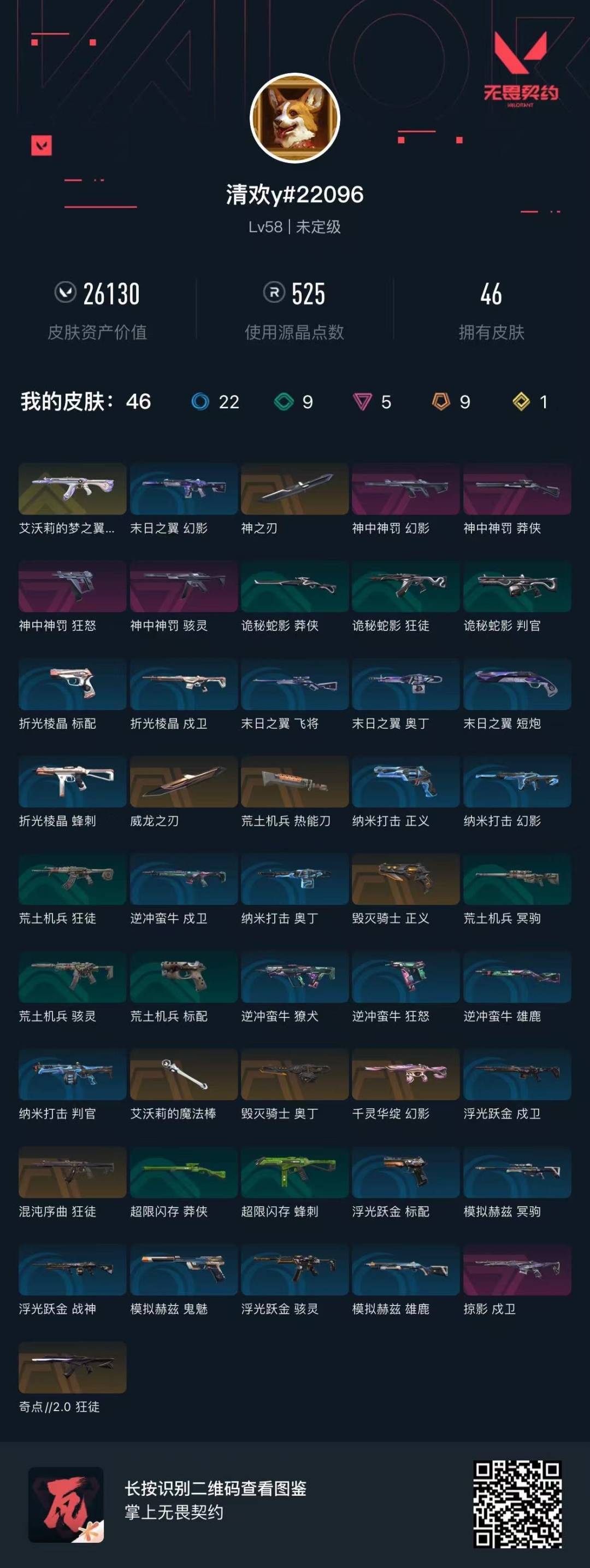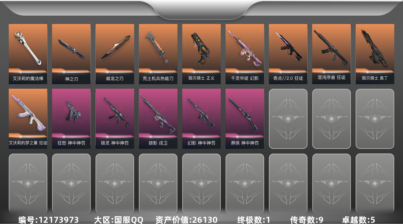[12173973]9橙皮 1金皮 5紫皮 46皮肤 13英雄 68卡面 525已用源晶 未定级 优质装备:幻影-千灵华绽,狂徒-艾沃莉的梦之翼,狂徒-混沌序曲,狂徒-奇点//2.0,戍卫-掠影,威龙之刃,艾沃莉的魔法棒,正义-毁灭骑士,奥丁-毁灭骑士,荒土机兵热能刀,神之刃 套装:神罚套装,神中神罚套装 佩枪皮肤:狂怒-神中神罚 冲锋枪皮肤:骇灵-神中神罚 步枪皮肤:幻影-神中神罚 狙击枪皮肤:莽侠-神中神罚