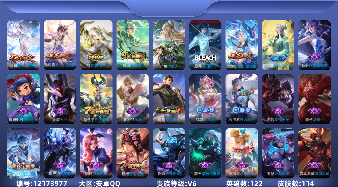 [12173977]V6 4传说 122英雄 114皮肤 可修改实名 优质装备:炽阳神光 传说皮:乘龙·问璇玑(孙尚香年限) 珍宝阁皮:万物之道 限定皮:愿照·千秋盛(女娲年限),逐霄战戟,鸣野蒿,五谷丰年,游园惊梦 史诗皮:器灵·浮梦炉,石田雨龙,奇遇星旅,乘龙·聚宝船(安琪拉年限),织梦人,电玩小子(小书包),特工魅影,永昼,雪夜绮愿(周瑜),百解令(蒙犽),龙骑士(小龙虾),节奏热浪,水果甜心,绅士熊喵,天才门将,星夜王子,暗隐猎兽者,鬼剑武藏,心灵战警,纤云弄巧,拒霜思,缤纷独角兽,逐浪之夏,月团寄思,金属风暴,圣诞恋歌,魅力维加斯,无心,未来纪元-赵云