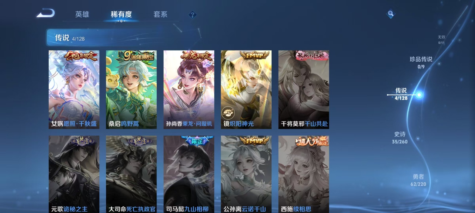 - [11824330]V9 1典藏 2珍品传说 23传说 126英雄 340皮肤 典藏英雄武则天 可修改实名 荣耀水晶:弑枪猎影(韩信典藏) 珍品传说:江户川柯南,时之奇旅-孙策 传说皮:铠冥王哈迪斯,幻光神枪,地狱火,仲夏夜之梦(大飞蛾),海洋之心,地狱之眼,一念神魔,云鹰飞将(小将军),无双飞将,乞巧织情,时之恋人-刘备(电焊工),超时空战士-狄仁杰 珍宝阁皮:妄想食味 限定皮:愿照·九州拓(澜年限),愿照·岁时盈(虞姬年限),愿照·山河定(司空震年限),愿照·众生和(妲己年限),愿照·千秋盛(女娲年限),逐霄战戟,陌上桑,鸣野蒿,夏侯惇霜北刀,至尊宝,白虎志(电光耗子),凤求凰(白切鸡),魔法小厨娘,飞衡(韩信年限),至美·乘鲤谣,天狼狩猎者,逐梦之星,岱宗(典韦年限),天狼溯光者,李小龙,辉光之辰,猪悟能,大圣娶亲,天魔缭乱,青春决赛季,冰霜恋舞曲,神奇女侠 史诗皮:星界战将,茶境仙,器灵·浮梦炉,龙之律动,石田雨龙,百相守梦-百里守约,百相守梦-黄忠,戍鼓铭心,东方月初,蒙犽顽岩魄,埋骨钱,海诺心动手记,百相守梦-周瑜,化蝶舞,破空之剑,紫霞仙子,苍穹之光,黄金分割率,特工魅影,千年之狐,永昼,冰冠公主,青蛇,偶像歌手,晚萤,魅语,末日机甲-吕布,猫狗日记-孙策,猫狗日记-大乔,时之恋人-孙尚香,乱世虎臣,节奏热浪,修罗,女仆咖啡,摇滚巨星,水果甜心,绅士熊喵,天才门将,星夜王子,心灵骇客,功夫厨神,德古拉伯爵,暗隐猎兽者,幽灵船长,鬼剑武藏,暗渊魔法,心灵战警,乐园奇幻夜,天秀·启明,舞动绿茵,地狱岩魂,纤云弄巧,缤纷独角兽,乘风破浪,逐浪之夏,水晶猎龙者,曙光守护者,箭羽风息,金属风暴,圣诞狂欢,圣诞恋歌,鹰眼统帅,暗夜贵公子,魅力维加斯,赏金猎手,未来纪元-赵云