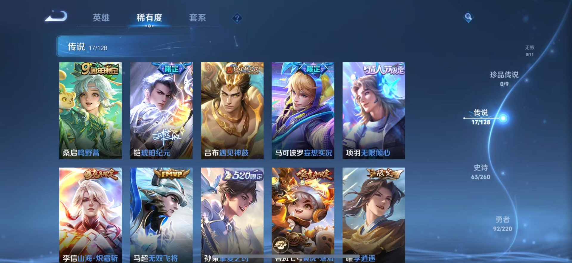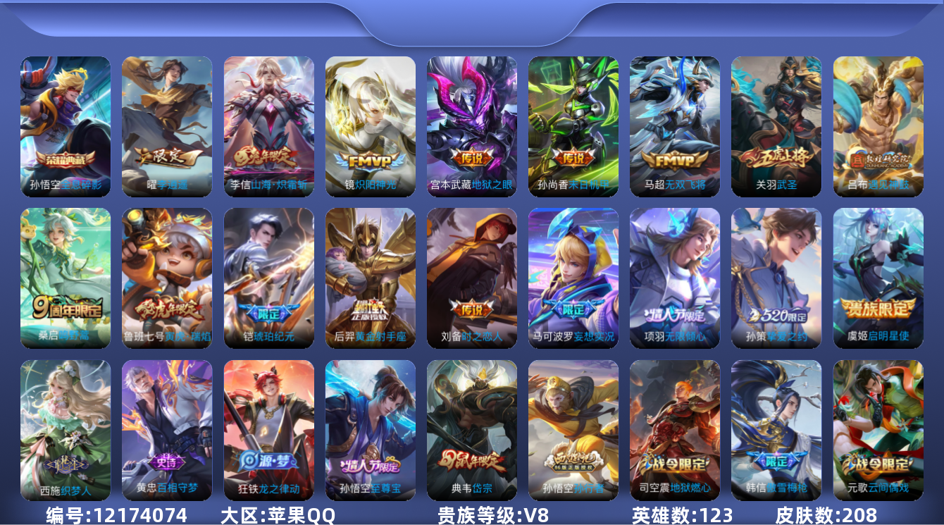 [12174074]V8 1典藏 17传说 123英雄 208皮肤 可修改实名 优质装备:全息碎影(猴子典藏),黄金射手座,炽阳神光,末日机甲-孙尚香(绿蚂蚱),地狱之眼,李逍遥,时之恋人-刘备(电焊工),挚爱之约,无双飞将,山海·炽霜斩(李信年限),妄想实况,遇见神鼓,琥珀纪元铠 珍宝阁皮:女武神,玩趣恶龙 限定皮:鸣野蒿,至尊宝,傲雪梅枪,无限倾心-项羽,瑞麟志(木兰年限),高山流水,五谷丰年,武圣,梁祝,岱宗(典韦年限),李小龙,孙行者,寅虎·御盾(廉颇年限),寅虎·瑞焰(虎皮蛋子),百木心枪 史诗皮:龙之律动,琥珀纪元伽罗,百相守梦-黄忠,织梦人,紫霞仙子,黄金分割率,特工魅影,永昼,江河有灵,百解令(蒙犽),高渐离燃音魔法,冰冠公主,青蛇,电玩·爆裂旋风,末日机甲-吕布,猫狗日记-孙策,乱世虎臣,节奏热浪,修罗,女仆咖啡,水果甜心,绅士熊喵,星夜王子,功夫厨神,暗隐猎兽者,幽灵船长,鬼剑武藏,暗渊魔法,心灵战警,纤云弄巧,拒霜思,缤纷独角兽,逐浪之夏,水晶猎龙者,曙光守护者,金属风暴,圣诞恋歌,鹰眼统帅,雪上飞焰,赏金猎手,滕王阁序,寅虎·御盾,无心