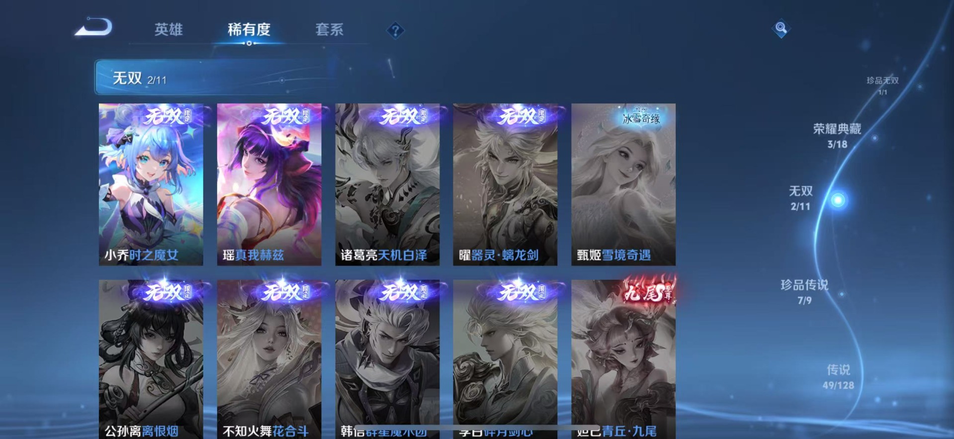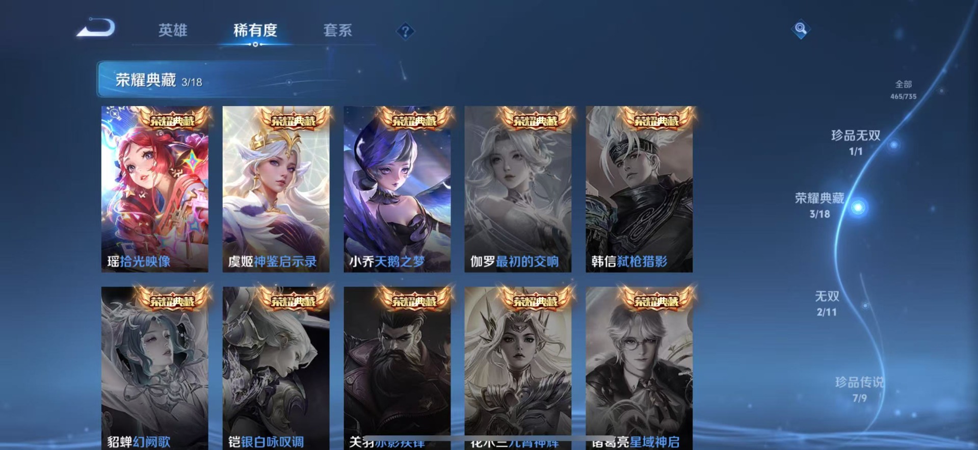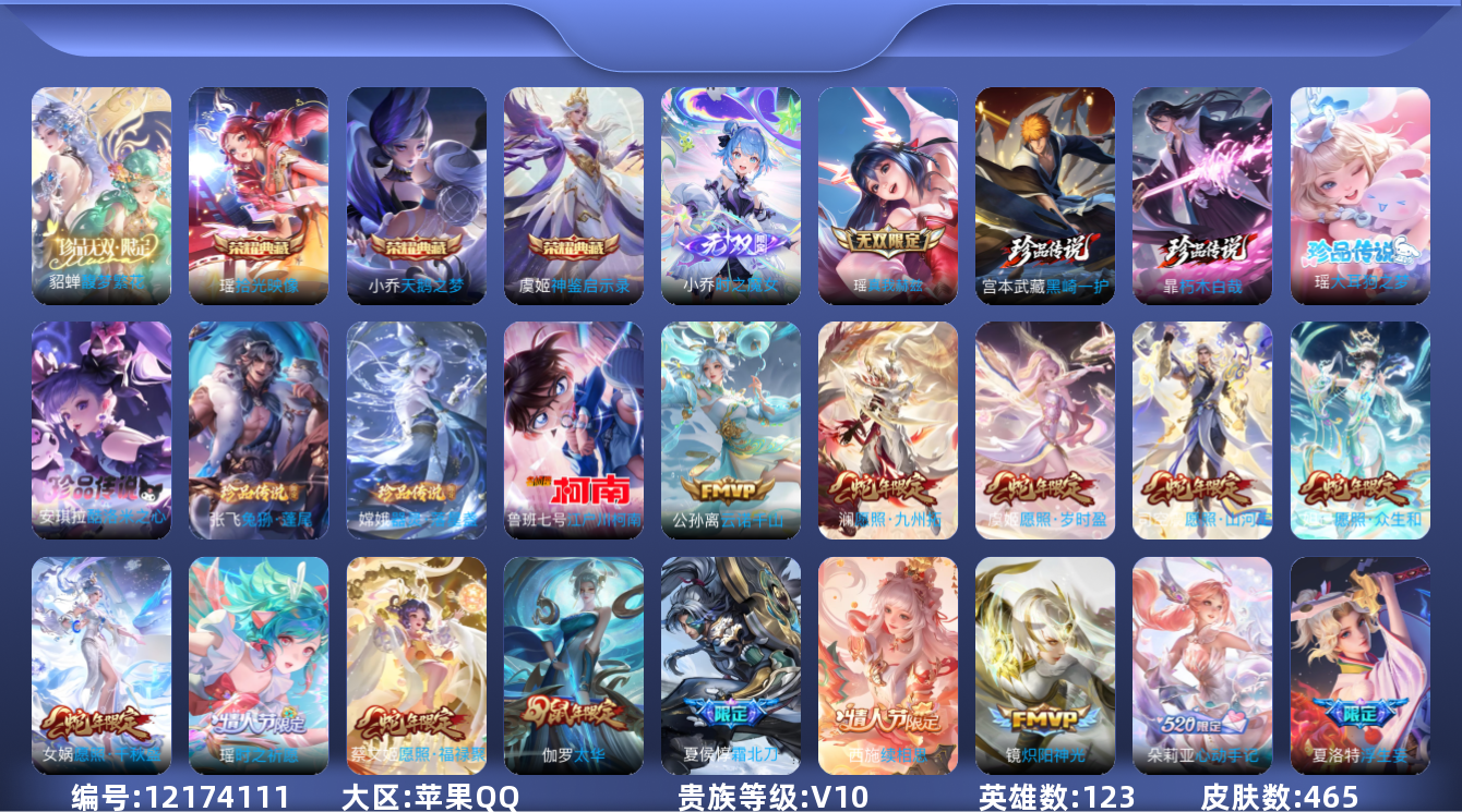 [12174111]V10 3典藏 1珍品无双 2无双 7珍品传说 49传说 123英雄 465皮肤 可修改实名 女号 优质装备:馥梦繁花,天鹅之梦(小乔典藏),真我赫兹(瑶)(瑶无双),神鉴启示录,小乔时之魔女(小乔无双),拾光映像(瑶典藏),江户川柯南,器灵·落星盏,酷洛米之心,大耳狗之梦,朽木白哉,黑崎一护,黄金狮子座,黄金白羊座,猫影幻舞,炽阳神光,云霓雀翎,末日机甲-孙尚香(绿蚂蚱),仲夏夜之梦(大飞蛾),音你心动-小乔,飞鸢探春,乞巧织情,超时空战士-狄仁杰,花朝如约(花篮子),碎云,山海·琳琅生(小乔年限),炽翼辉光(娃娃菜牛角包),画中仙,浮生妄,记忆之芯(机甲兔),鹤羽星尊,灼幽烈阳,妄想实况,妄想奇谈,大乔-时之奇旅,小动物乐团,艾琳觅芳踪,朵莉亚心动手记,牧神诗旅 珍品传说:兔狲·蓬尾 传说皮:云诺千山,续相思,星之鸣奏,祥瑞亨通,幻光神枪 珍宝阁皮:蔷薇恋人,玩趣恶龙 限定皮:愿照·九州拓(澜年限),愿照·福禄聚(蔡文姬年限),愿照·岁时盈(虞姬年限),愿照·山河定(司空震年限),愿照·众生和(妲己年限),愿照·千秋盛(女娲年限),逐霄战戟,映山客,陌上桑,鸣野蒿,夏侯惇霜北刀,凤凰于飞,太华(伽罗年限),异界灵契(白毛香),寅虎·展翼(孙膑年限),前尘镜,星穹之声,时之彼端,魔法小厨娘,山海·碧波行(瑶年限),至美·化雀舞,遇见飞天,高山流水,五谷丰年,幽恒(沐浴露),天狼运算者,游园惊梦,梁祝,天狼溯光者,天狼绘梦者,霸王别姬-虞姬,奇迹圣诞,纯白花嫁,猪悟能,大圣娶亲,云端筑梦师,热情桑巴,女儿国国王,寅虎·心曲(虎婆),时之祈愿-瑶(瑶传限),启示之音,匿光启智者,时之奇旅-妲己,神器·万象笔,山海·玄木吟(马可年限) 史诗皮:赞萌露比,鸭鸭历险记-刘禅,苍鳞隐世,器灵·浮梦炉,糖绘人间,狼魂孤将,绮世丹青,瑰影绮梦,化蝶舞,龙之律动,灵蛊蚀心,雪豹·霜爪,星界战将,藏狐·褐绒,布丁狗之誓,小牛鸭,石田雨龙,百相守梦-周瑜,戍鼓铭心,茶境仙,埋骨钱,谪仙醉月,炽弈燎原,撼地雄心,破空之剑,战舞者,涂山红红,东方月初,芈月浮光幕影,怒海争锋,海诺心动手记,夜落电台,蔬乡物语(鲁班七号),幻珠鲛人,百相守梦-百里守约,遇见神鹿,紫霞仙子,电玩小子(小书包),黄金分割率,特工魅影,闲日渔趣,白蛇,匿光侦查者,雪夜绮愿(周瑜),青蛇,魅语,偶像歌手,