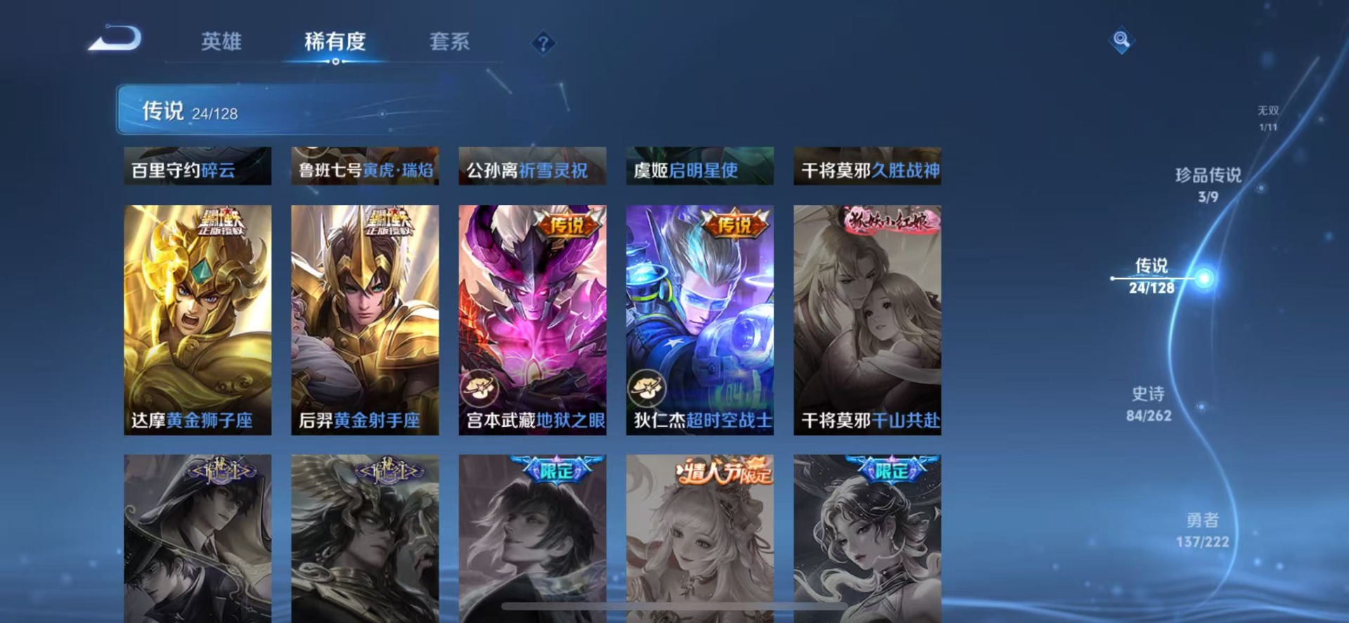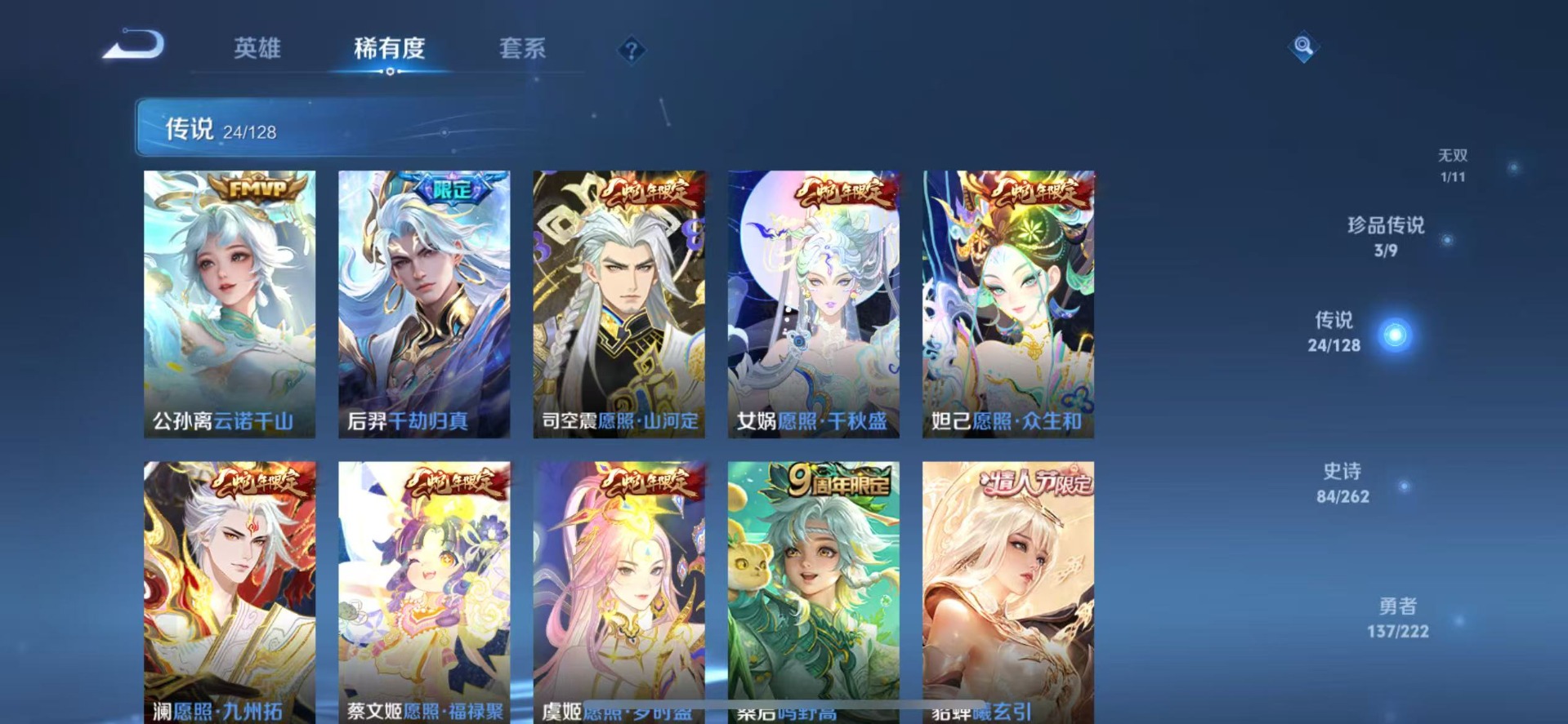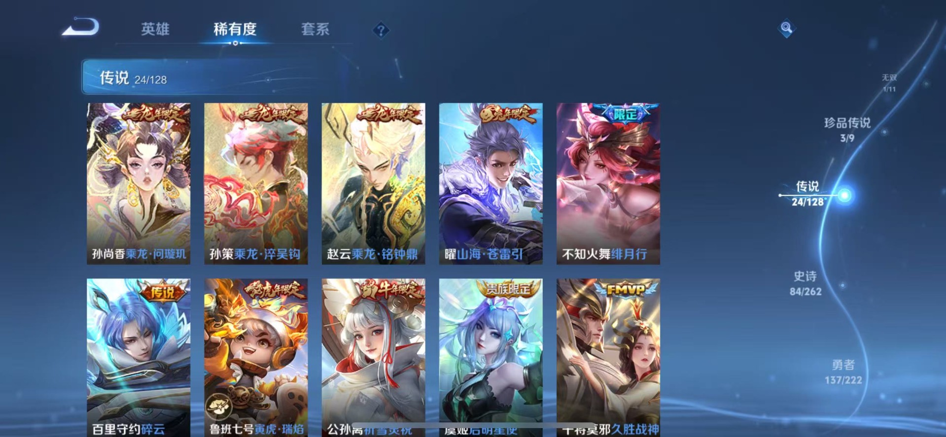 - [11253618]V8 2典藏 8传说 124英雄 249皮肤 可修改实名 荣耀水晶:鸣剑·曳影,全息碎影(猴子典藏) 传说皮:地狱火,末日机甲-孙尚香(绿蚂蚱),超时空战士-狄仁杰,妄想实况,夜礼服假面 珍宝阁皮:蔷薇恋人 限定皮:至尊宝,凤求凰(白切鸡),飞衡(韩信年限),遇见飞天,高山流水,诗剑行,五谷丰年,冰锋战神,游园惊梦,梁祝,李小龙,朱雀志(守约年限),如梦令-后羿,一生所爱,大圣娶亲,美猴王,山海·玄木吟(马可年限) 史诗皮:白龙吟,黄金分割率,千年之狐,江河有灵,百解令(蒙犽),偶像歌手,暗夜猫娘,末日机甲-吕布,猫狗日记-孙策,乱世虎臣,修罗,女仆咖啡,水果甜心,星夜王子,心灵骇客,功夫厨神,暗隐猎兽者,鬼剑武藏,心灵战警,舞动绿茵,地狱岩魂,繁星吟游(呼啦呼啦),拒霜思,缤纷独角兽,乘风破浪,水晶猎龙者,曙光守护者,热力回旋,金属风暴,原初追逐者,圣诞狂欢,圣诞恋歌,鹰眼统帅,魅力维加斯,无心,未来纪元-赵云